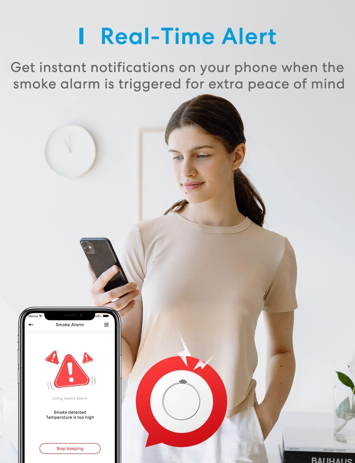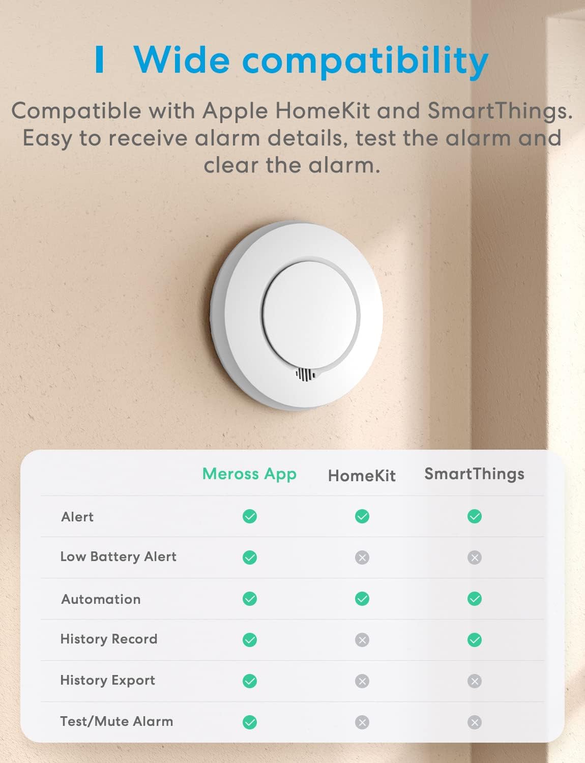 Gdy alarm wykryje dym, automatycznie wyda dźwięk ostrzegawczy. Jeżeli natomiast korzystasz z kilku alarmów jednocześnie, wystarczy, że jeden z nich wyłapie dym, a wszystkie dostępne urządzenia się uruchomią. Oprócz wykrywania dymu może również wykryć przegrzanie, a dzięki kompatybilności z HUBEM, dostępnym do nabycia oddzielnie, możesz połączyć urządzenie w jeden system. Dedykowana aplikacja Meross lub aplikacja Apple Home pozwala na kontrolę czujników i odbiera alerty w sytuacji zagrożenia.