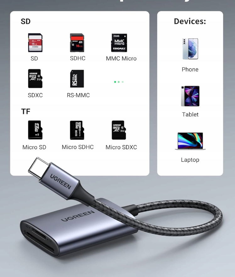 - ✴️Uniwersalna kompatybilność: adapter kart Micro SD USB C firmy UGREEN jest w pełni kompatybilny z urządzeniami iPhone 17 16 15 Pro/Pro Max, Samsung Galaxy S23/S22/S21/A54/A34/S10/Note 20, MacBook Pro/Air, Mac mini, iPad Pro 2023/2022/2021/2020/2018, iPad Air 5/4, OnePlus 11/11R/10R/Nord 3/ i innymi urządzeniami USB-C.