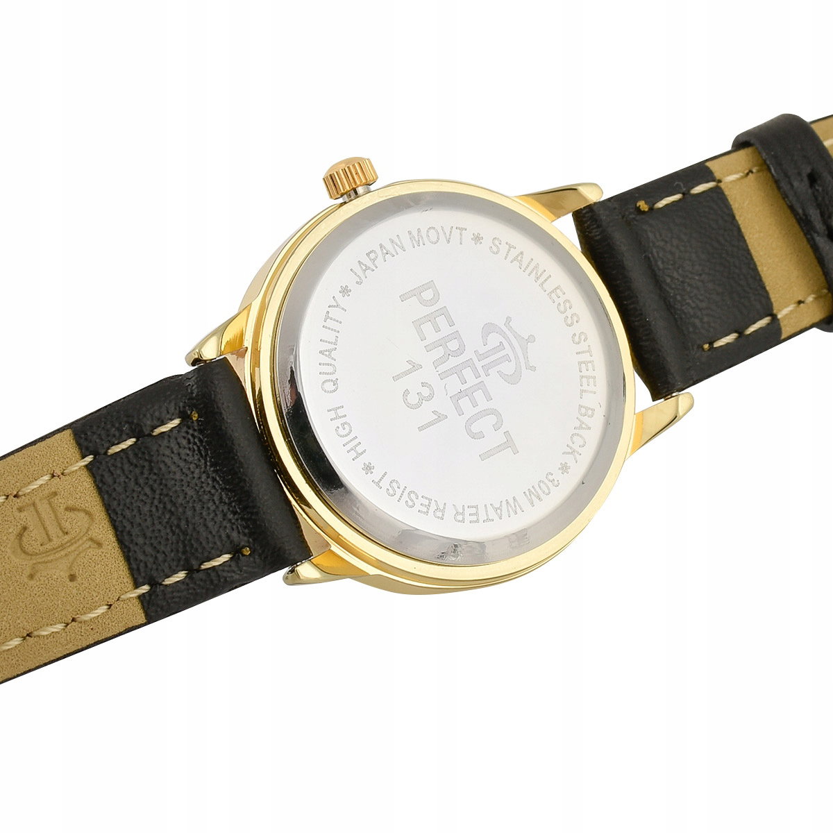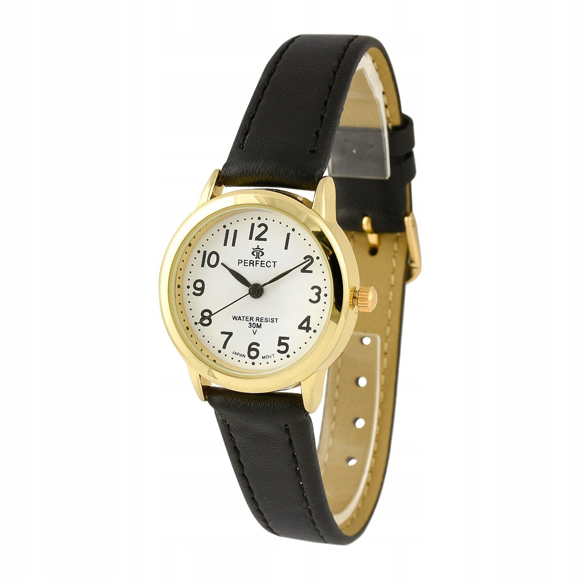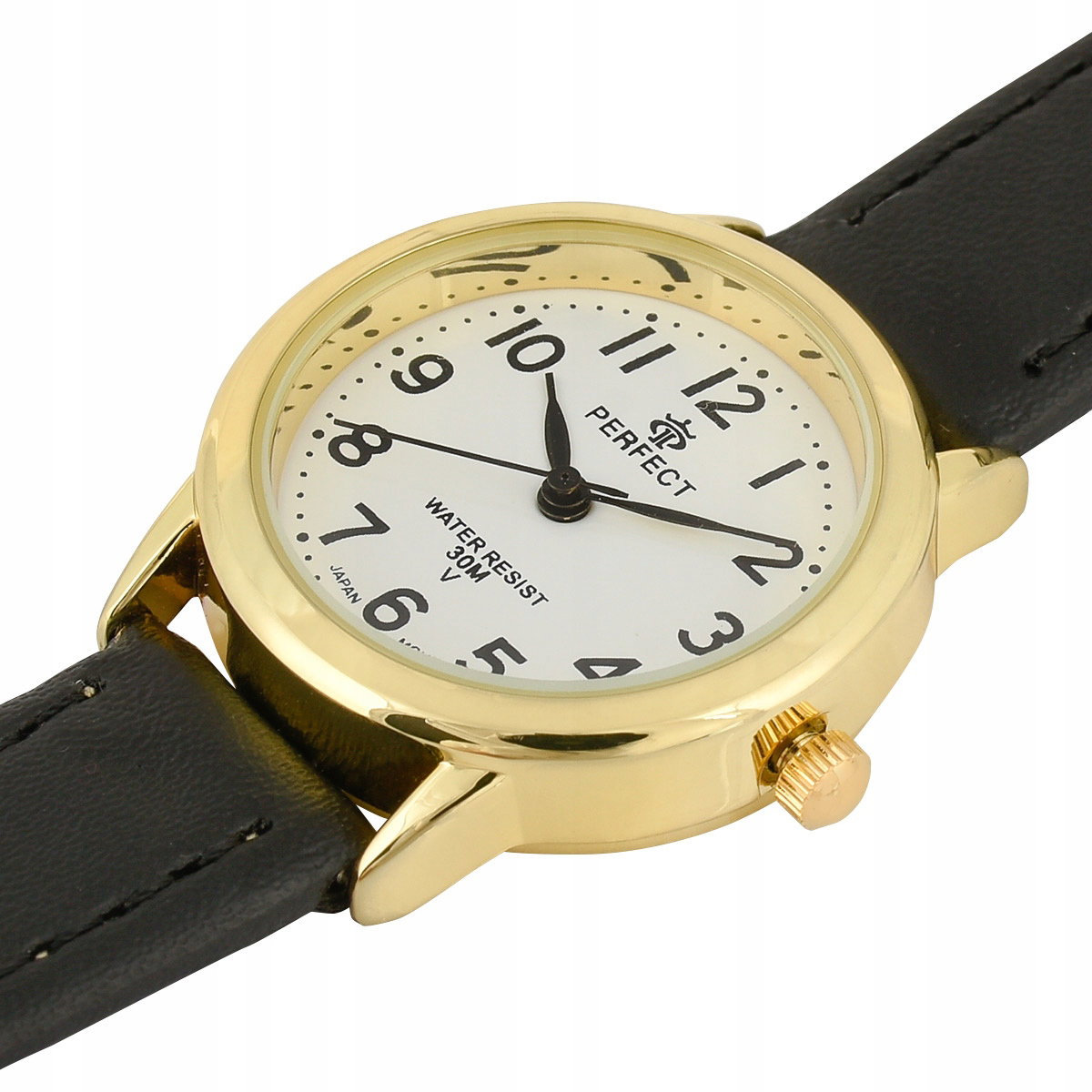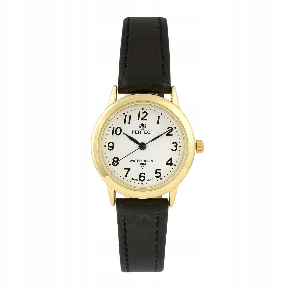 Klasyczny damski zegarek sprawdzonej marki Perfect na klasycznym, czarnym pasku, ze złotą kopertą.