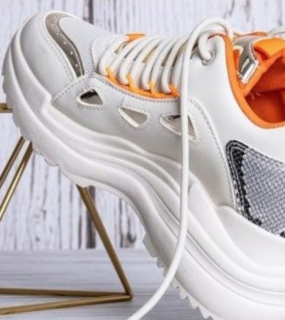 Sneakersy damskie na wysokiej podeszwie w kolorze białym z pomarańczowymi elementami