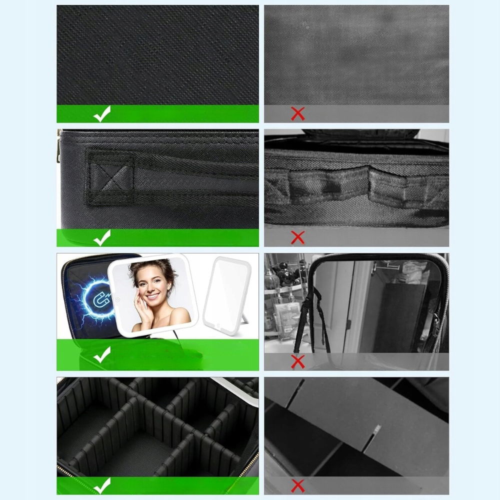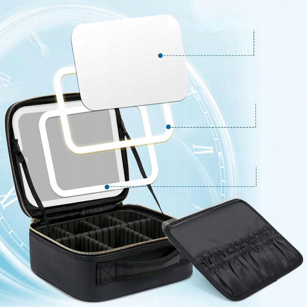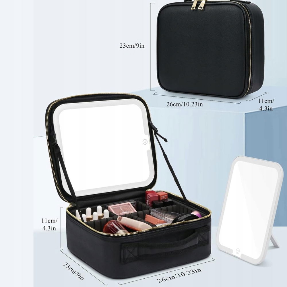 Elegancka i funkcjonalna kosmetyczka z wbudowanym lusterkiem LED, idealna do przechowywania kosmetyków i makijażu.