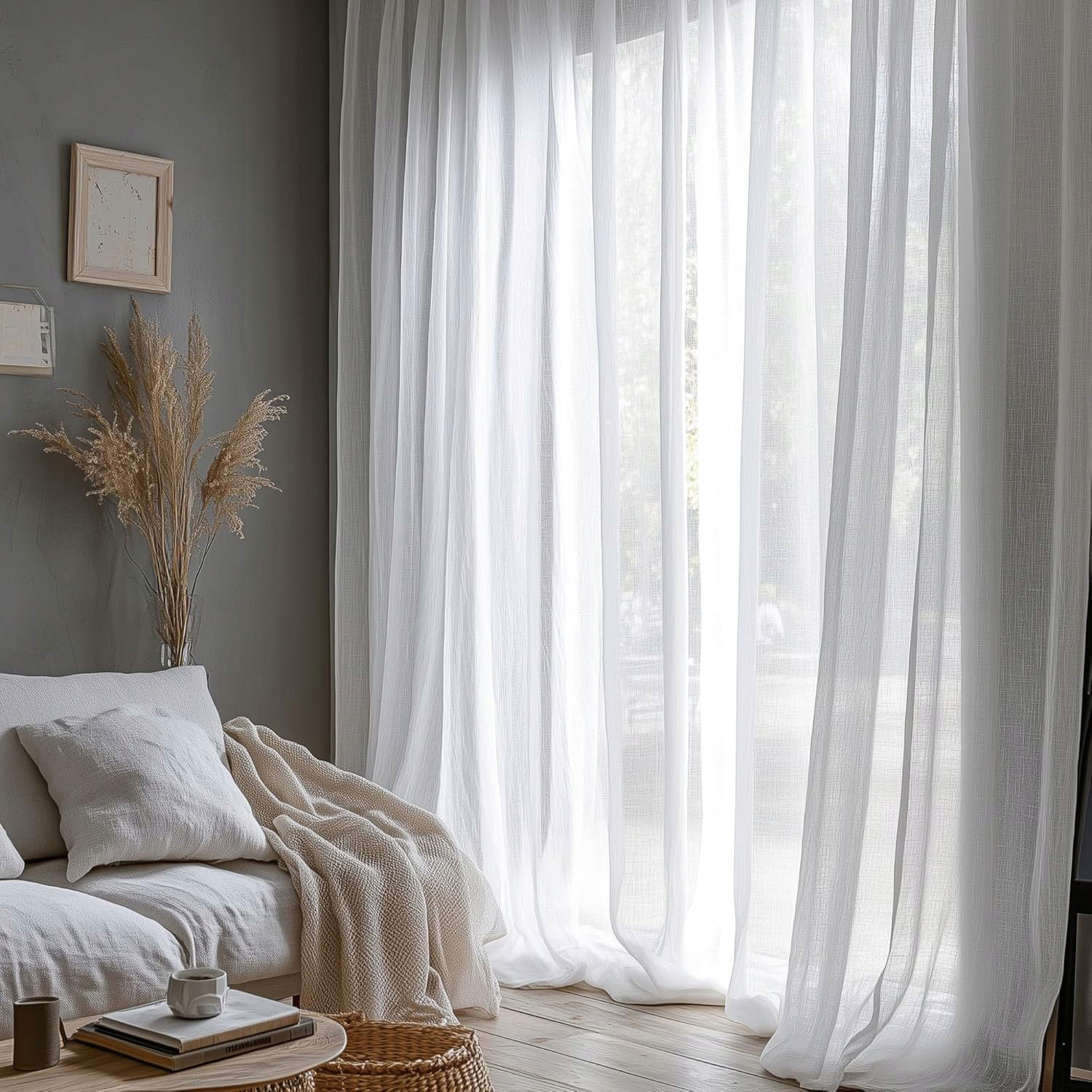 Zasłony wykonane są z wysokiej jakości półprzezroczystej tkaniny, która imituje strukturę naturalnego lnu. Delikatnie filtrują światło, tworząc jasne, ale nieoślepiające wnętrze – idealne do odpoczynku, pracy i codziennego relaksu.