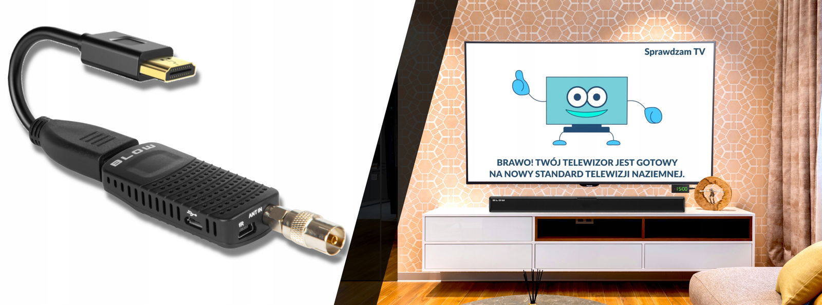 Dekoder BLOW został zaprojektowany z myślą jak najprostszej i funkcjonalnej instalacji dla każdego użytkownika. Dołączone do zestawu akcesoria w postaci przejściówki HDMI i adaptera pozwolą na jeszcze większe możliwości i swobodę podłączenia do naszego telewizora.