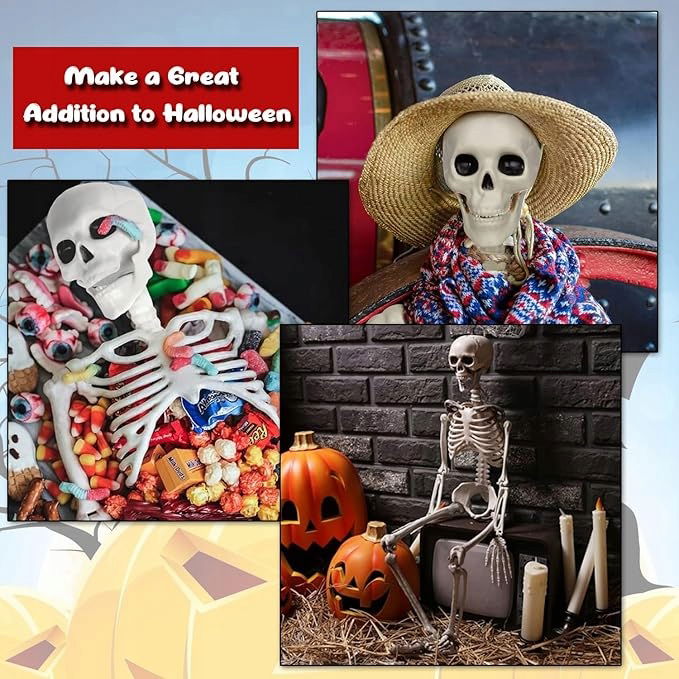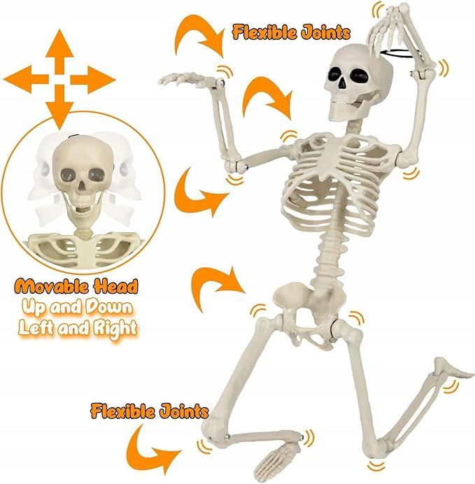 Materiał premium - Szkielet na Halloween wykonany jest z wysokiej jakości wytrzymałego tworzywa sztucznego na każdą pogodę, które jest trwałe, nietoksyczne i niełatwe do uszkodzenia. Wystrój szkieletu jest wodoodporny i trwały, łatwy do przechowywania i użytkowania wewnątrz lub na zewnątrz rok po roku.