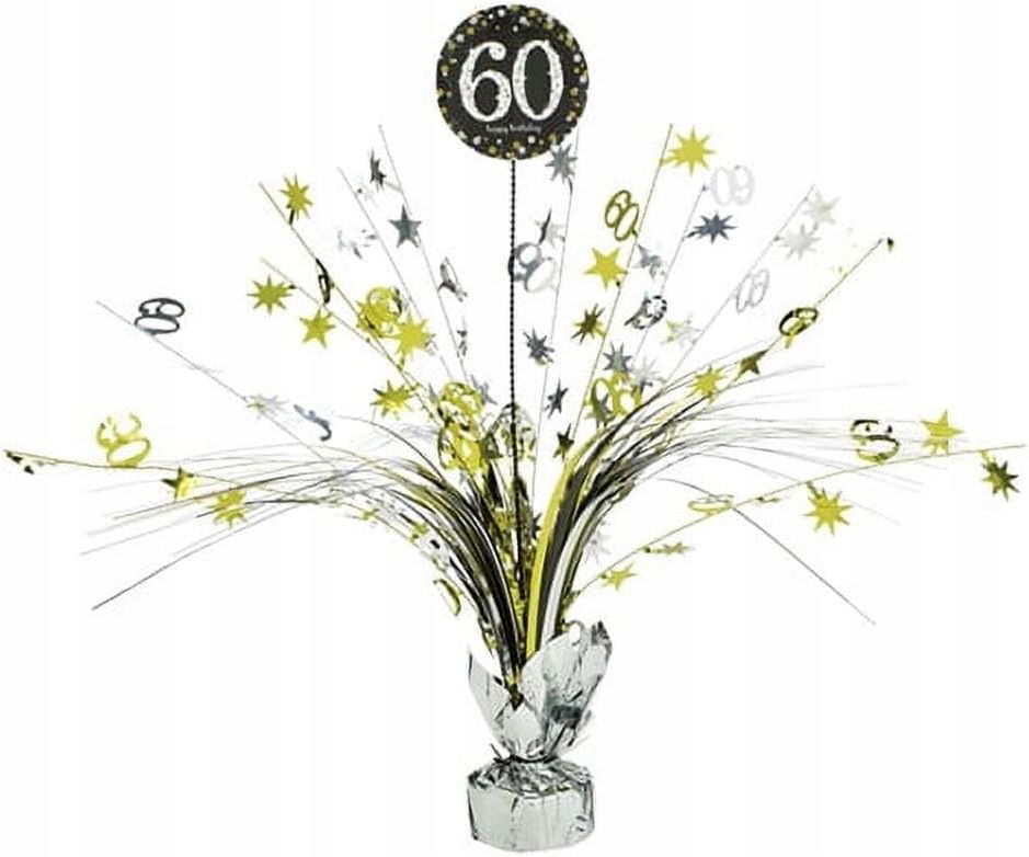 Dekoracja i obciążnik 2w1. Produkt może służyć jako obciążnik do balonów dmuchanych helem lub po prostu jako dekoracja na 60 urodziny. Składa się z ciężkiej podstawy oraz kolorowych drucików zakończonych sześćdziesiątkami i gwiazdkami. Całość zachowana w srebrno złotej kolorystyce. Dodatkowo wpleciono w niego długie kawałki sztywnej folii. Całość po rozłożeniu stanowi piękny bukiet przypominający rozłożysty kwiat doniczkowy. Na środku jest kartonowe kółko z napisem 60 HAPPY BIRTHDAY!