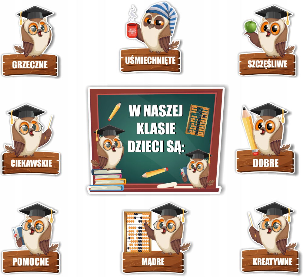 • 8 sówek z napisami. Rozmiar sowy ok a4. (30cmx21cm)