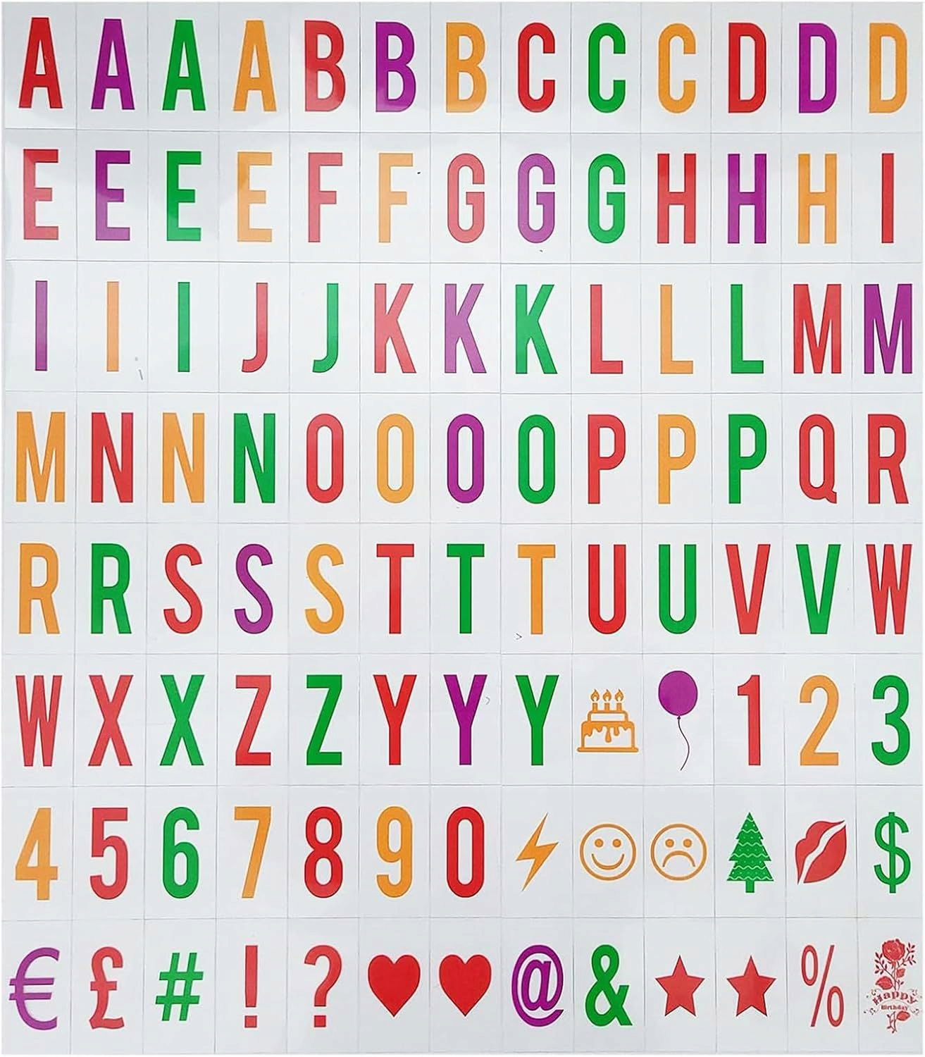 - Szablon z 104 literami alfabetu: jeden zestaw zawiera 104 szablony z literami, cyframi, emotikonami i różnymi znakami specjalnymi, takimi jak etykiety, serca i gwiazdki. Znaki mają wymiary około 35 x 65 mm.