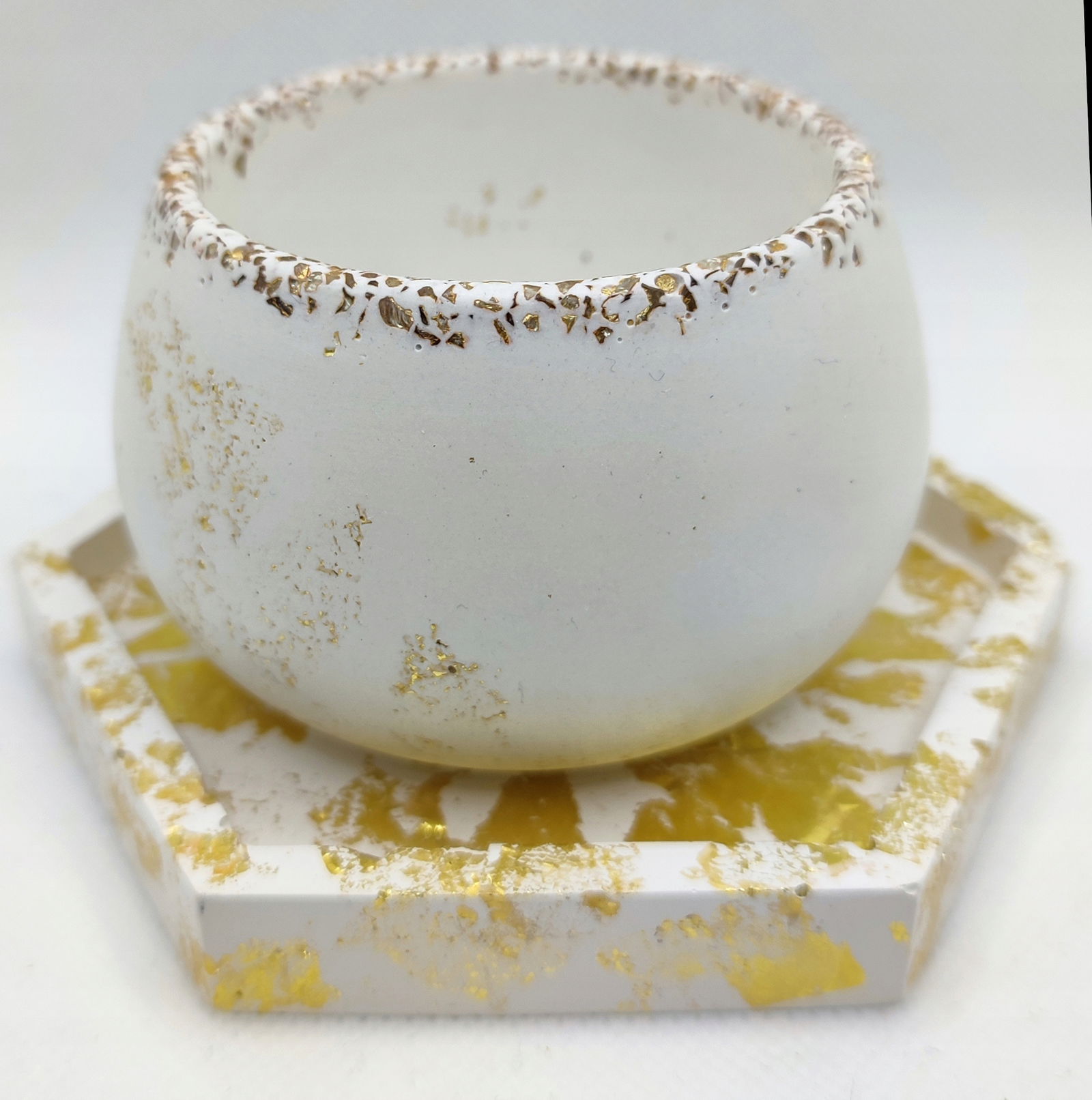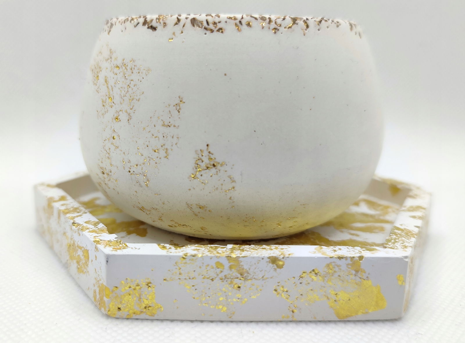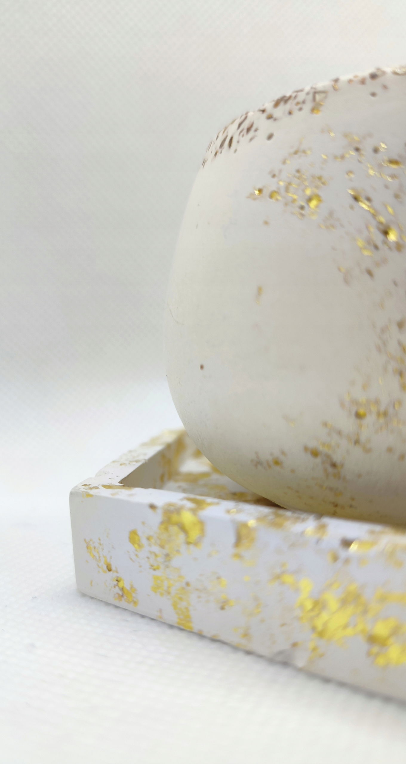 Prezentujemy wyjątkowy Hand Made - figurkę z gipsu polimerowego w kształcie biało-złotej matowej donicy z towarzyszącą jej podstawą. Ta delikatna i elegancka dekoracja wnętrza została starannie wykonana z najwyższą precyzją, aby spełnić oczekiwania najbardziej wymagających.