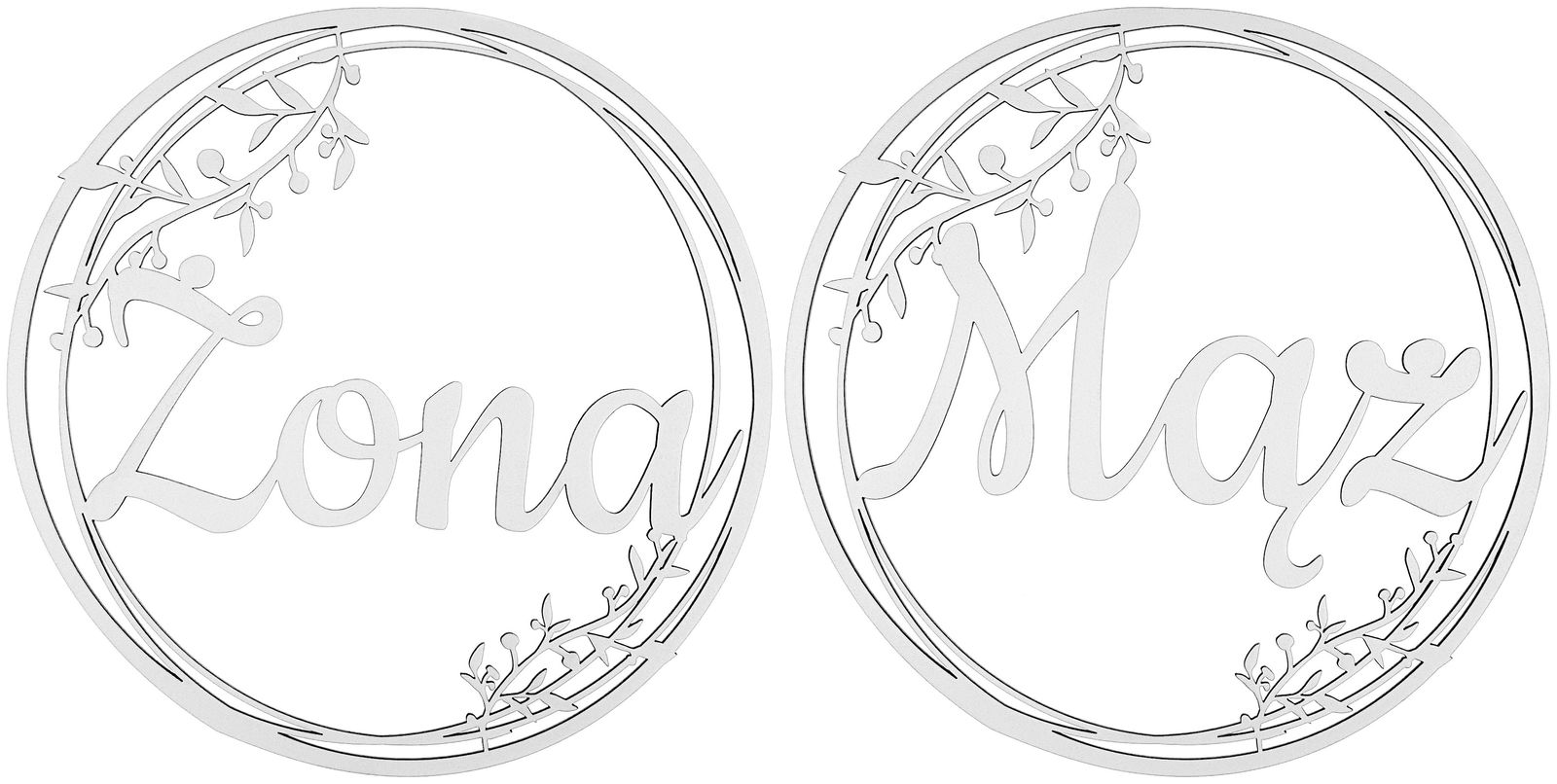 Dekoracje na wesele koła w kolorze Białym Żona oraz Mąż o wymiarach ok. 40x40 cm.