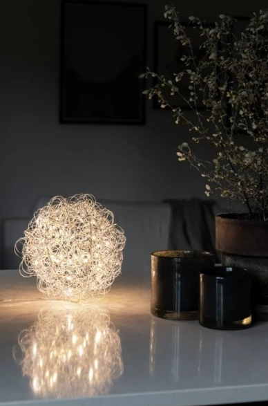 - Główne cechy produktu: - 40 wbudowanych diod LED – trwałe i energooszczędne źródło światła - Miękka, ciepła poświata – tworzy przytulną atmosferę - Nowoczesny design z drutu – lekka i subtelna forma - Zasilanie z sieci (230V) – wygoda bez potrzeby baterii - Średnica kuli: 20,6 cm – idealna na stół, komodę lub parapet - Długość przewodu: 5 m – swoboda aranżacji dzięki przejrzystemu kablowi - Zastosowanie wewnętrzne (IP20) – idealna do salonu, sypialni czy przedpokoju