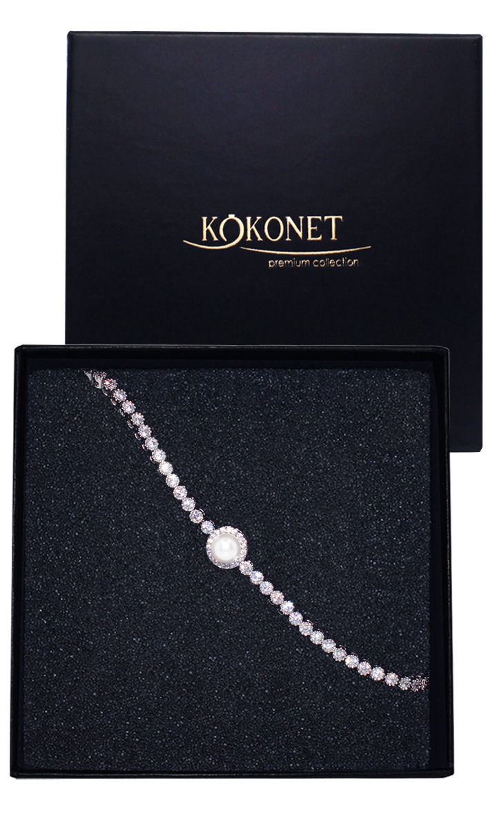 Skromna bransoletka ślubna z motywem cyrkonii i pojedynczej perełki to połączenie elementów stylów glamour oraz vintage. Dzięki tej bransoletce uzupełnisz stylizację ślubną o klasyczną i delikatną biżuterię.