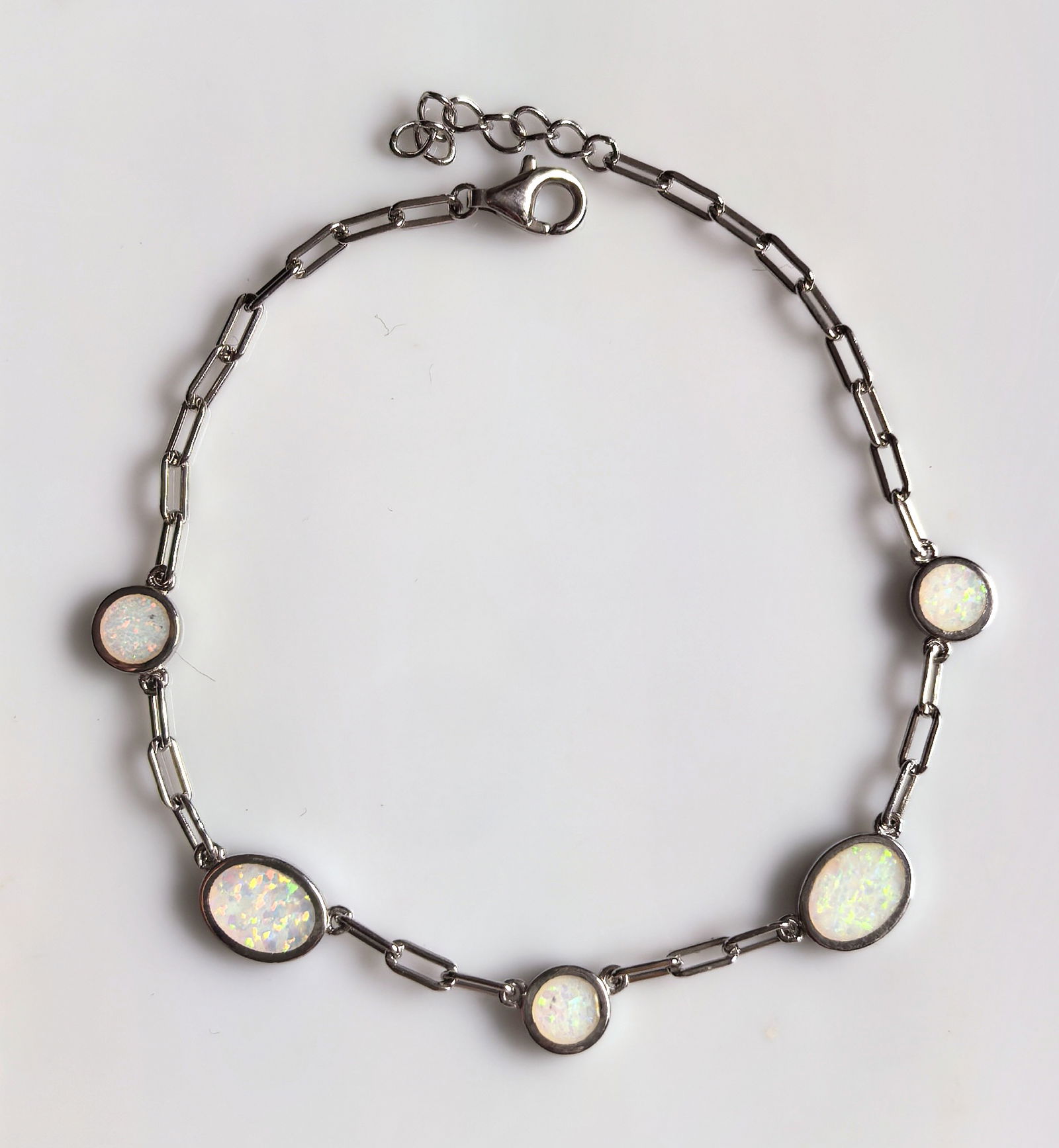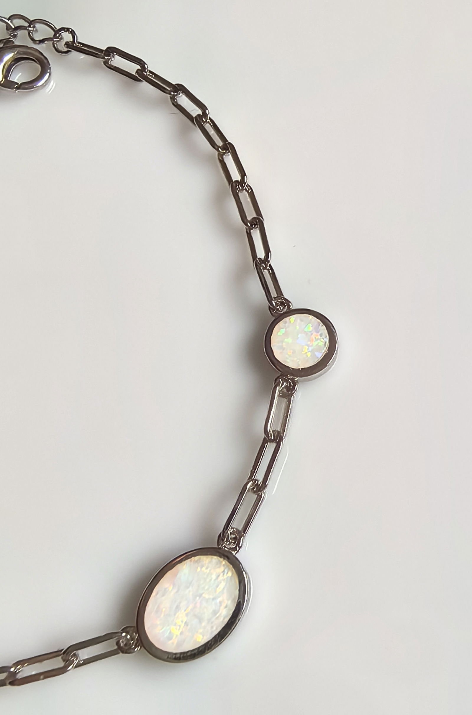 pięć okrągłych kamieni o opalizującym połysku zostało osadzonych w gładkich, srebrnych oprawach i równomiernie rozmieszczonych na geometrycznym łańcuszku z prostokątnych ogniw