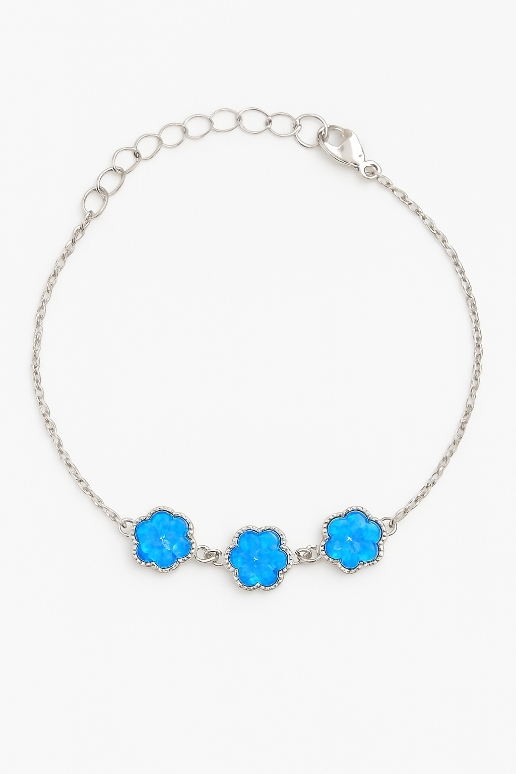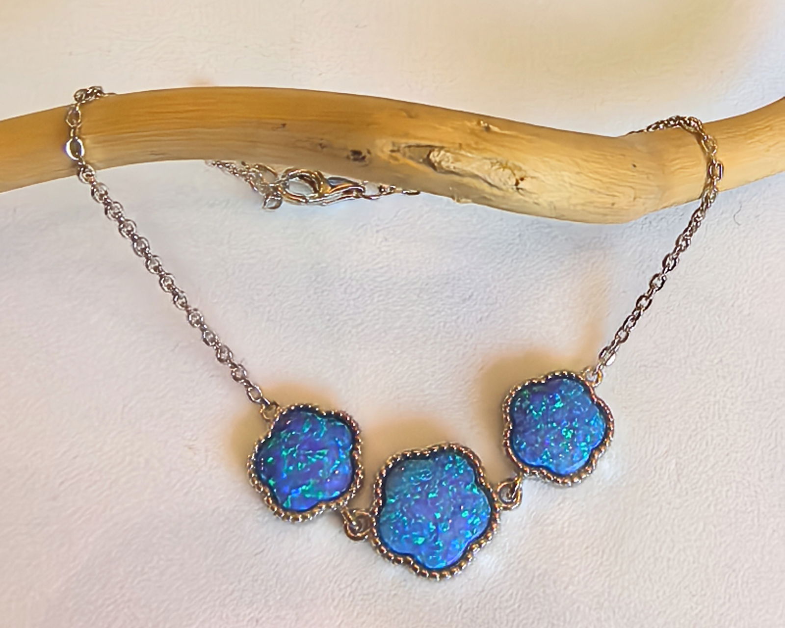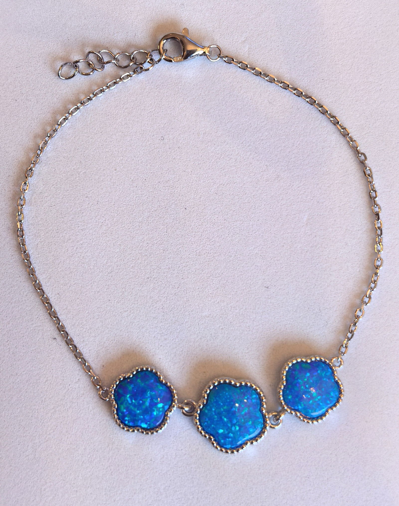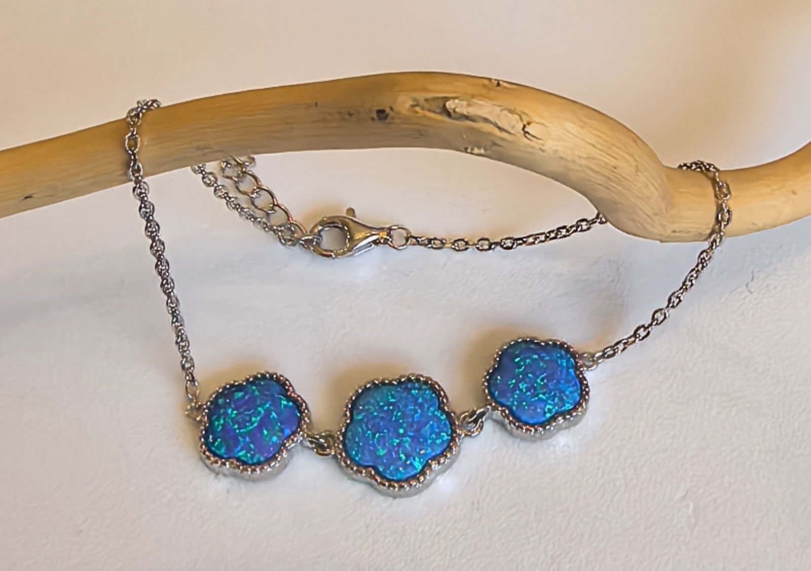 • trzy opale w kształcie kwiatów, o intensywnym niebieskim odcieniu z nutą zieleni i fioletu, mienią się przy każdym ruchu dłoni