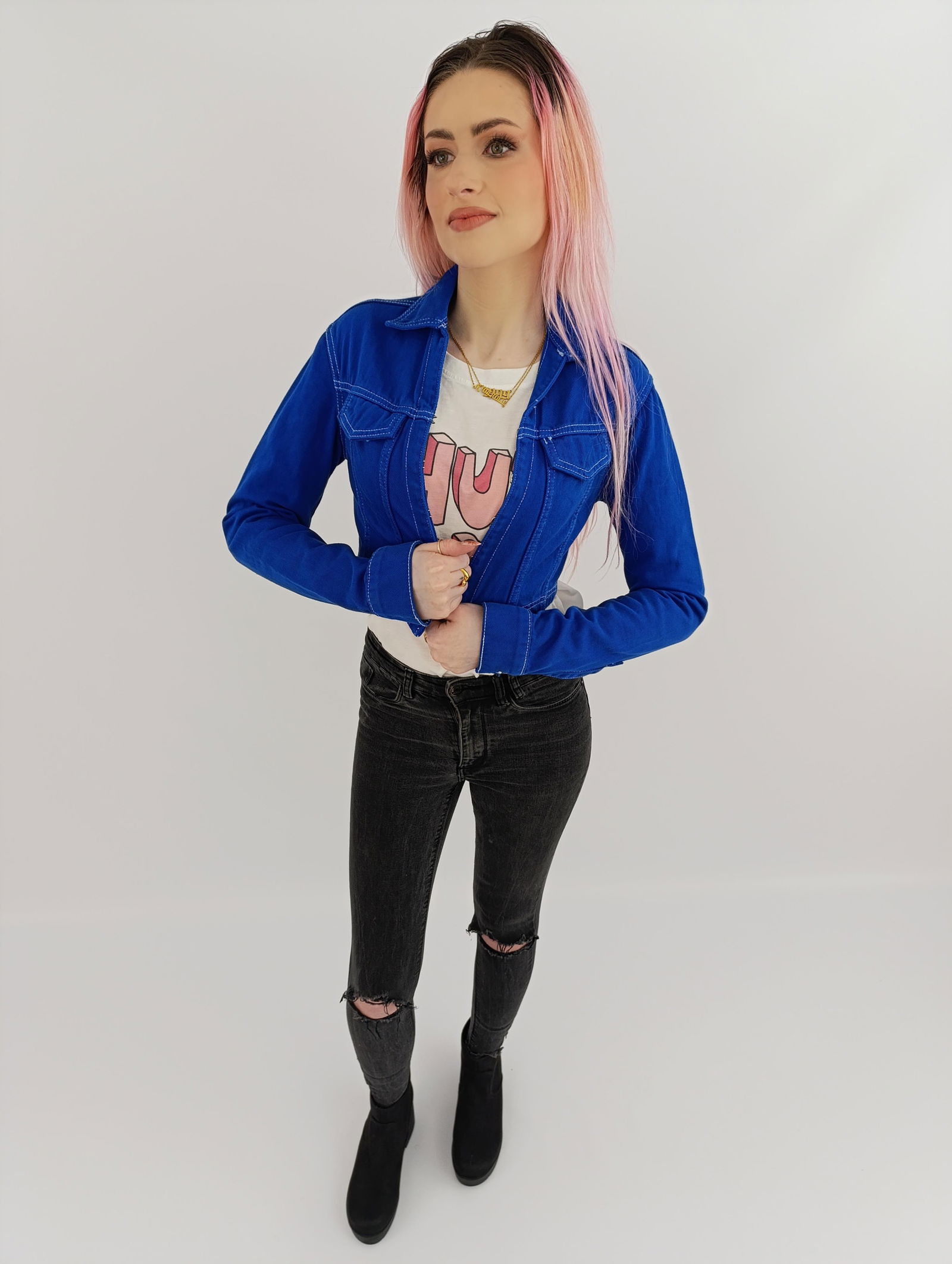 Kurtka damska marki Denim Co., wykonana z bawełny, w modnym niebieskim kolorze - krótka kurtka katana jeansowa.