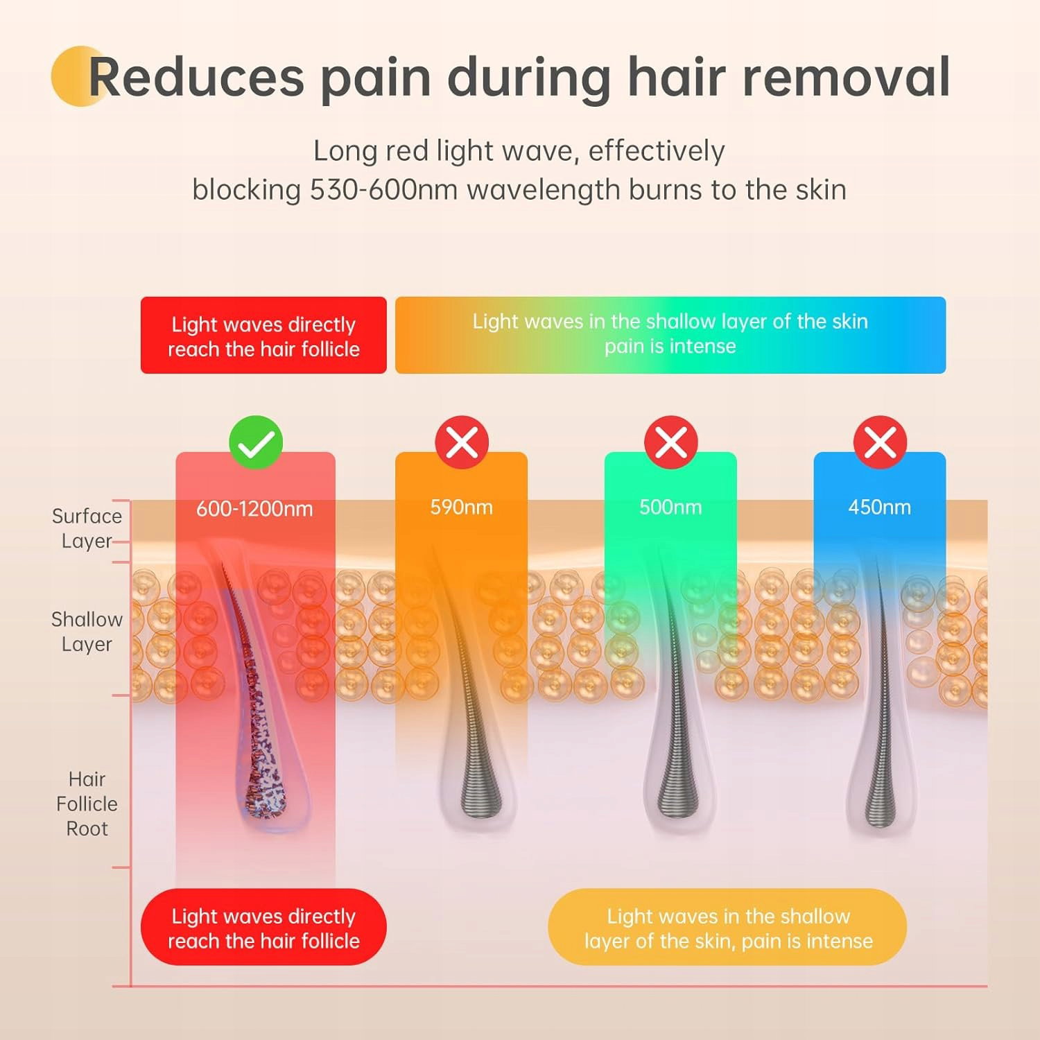 ✨System depilacji IPL wykorzystuje zaawansowaną i unikalną technologię IPL o czerwonym świetle 600 NM, fala czerwonego światła jest łatwiej i bezpieczniej absorbowana przez mieszki włosowe, zmuszając się do stanu uśpienia. W porównaniu z innymi popularnymi urządzeniami IPL, to urządzenie umożliwia szybsze i skuteczniejsze usuwanie włosów.