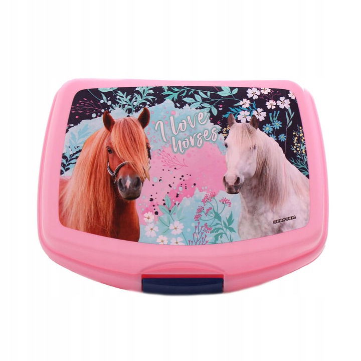 Śniadaniówka w postaci plastikowego pojemnika, idealna do przechowywania drugiego śniadania. Można w niej trzymać ulubione owoce, warzywa oraz kanapki. Na wieczku widoczne są dwa konie. Śniadaniówka jest doskonała do szkoły czy przedszkola. Śniadaniówka w kolorze różowym, zamykana na granatowy klips.
