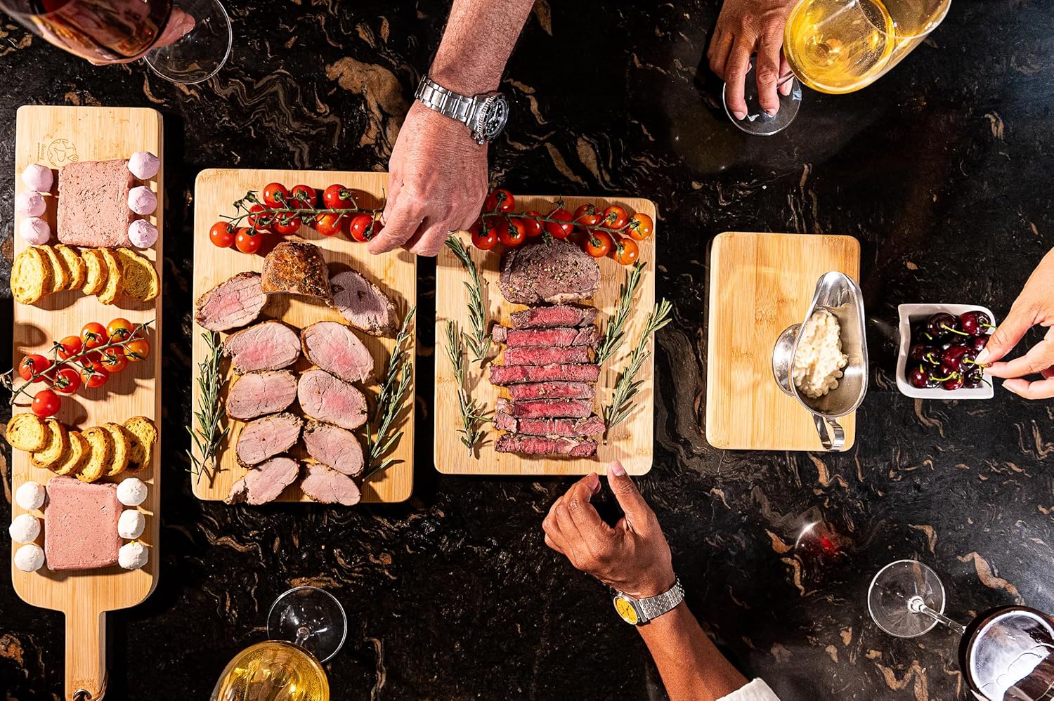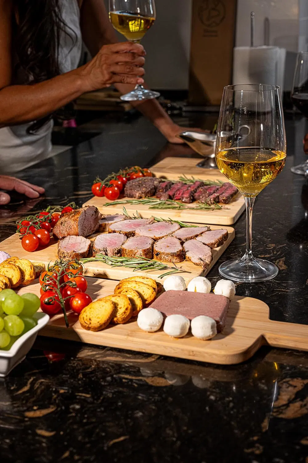 Każda deska posiada wbudowany rowek (slot), który skutecznie zbiera soki z mięsa czy owoców, utrzymując blat w czystości. Poza funkcją krojenia, deski te są również idealne jako deski do serwowania (serving boards) – możesz na nich elegancko prezentować wędliny (charcuterie boards), sery (cheese boards) czy tapas, dodając każdej potrawie rustykalnego uroku.