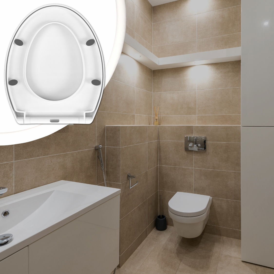 ✅ Pasuje do większości standardowych misek WC – dzięki regulowanym zawiasom.