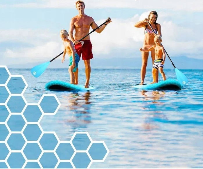 Deska SUP jest bogato wyposażona w akcesoria i nie pozostawia nic do życzenia. Jest ona stabilna i wszechstronna, możesz na niej stać, siedzieć, służy do ćwiczeń w obszarach pilatesu i jogi, w spokojnej wodzie lub w falach, do relaksującego wiosłowania lub kajakarstwa.