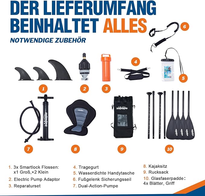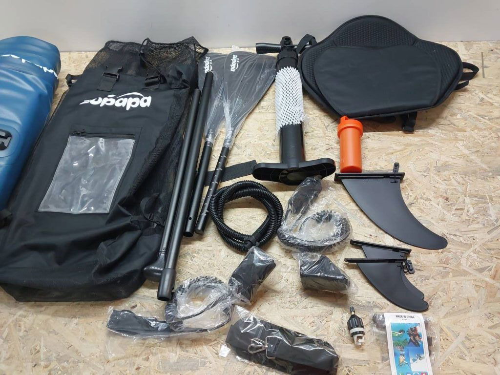 Kajak i wiosło: Nadmuchiwana deska SUP Zupapa jest wyposażona w zdejmowane siedzisko kajakowe i podwójne wiosło. Lekkie aluminiowe wiosło jest łatwe w montażu i regulacji wysokości. Dzięki naszym D-ringom w ciągu kilku sekund przekształcisz swój SUP w kajak SUP