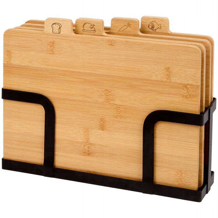 Zestaw desek do krojenia 4 w 1 + stojak to must-have w każdej kuchni. Dzięki niemu będziesz w stanie zachować porządek, dbać o higienę oraz zaoszczędzić czas i miejsce w trakcie gotowania.