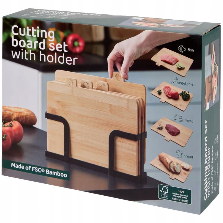 - 4 deski w zestawie – dedykowane do różnych rodzajów produktów spożywczych (warzywa, mięso, ryby, ogólne).