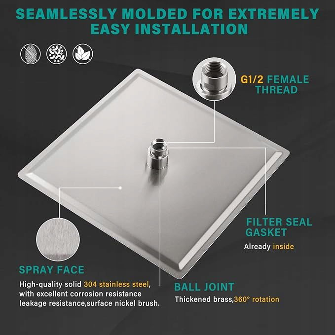 Wysokiej jakości stal nierdzewna: cała głowica prysznica deszczowego wykonana jest ze stali nierdzewnej 304, co gwarantuje solidną konstrukcję i długotrwałe użytkowanie, zapewniając maksymalną niezawodność.