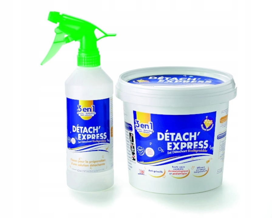 Detach Express Qualité Diamant Plus to sól odplamiająca, która pozwala na czyszczenie wszelkiego rodzaju tkanin, w tym tapicerki i ubrań. Oprócz tkanin nadających się do prania, ten środek czyszczący można używać do usuwania plam z tapet ściennych oraz powierzchni zmywalnych, takich jak toalety, lodówki czy kabiny prysznicowe. Ta sól z aktywnym tlenem działa, eliminując wszystkie plamy organiczne. Bez problemu radzi sobie z najbardziej uporczywymi zabrudzeniami, takimi jak krew, kawa, sos, olej, czekolada, wino i wiele innych.