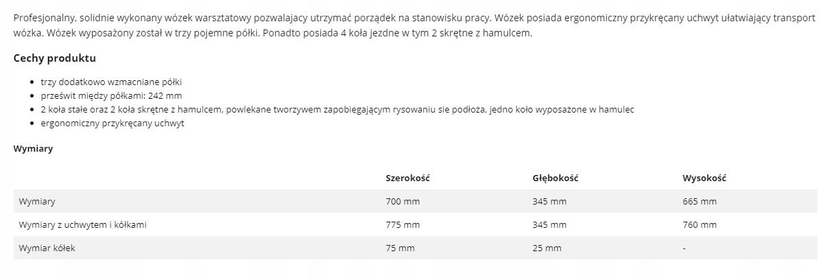 Dzięki solidnym 3 półkom zachowasz porządek w swoim warsztacie narzędziowym. Przestronne tłoczone z grubej blachy półki zapewnią w każdej chwili porządek i sprawią, że potrzebne narzędzia będą pod ręką. Wózek posiada 4 koła, w tym 2 kierowane.