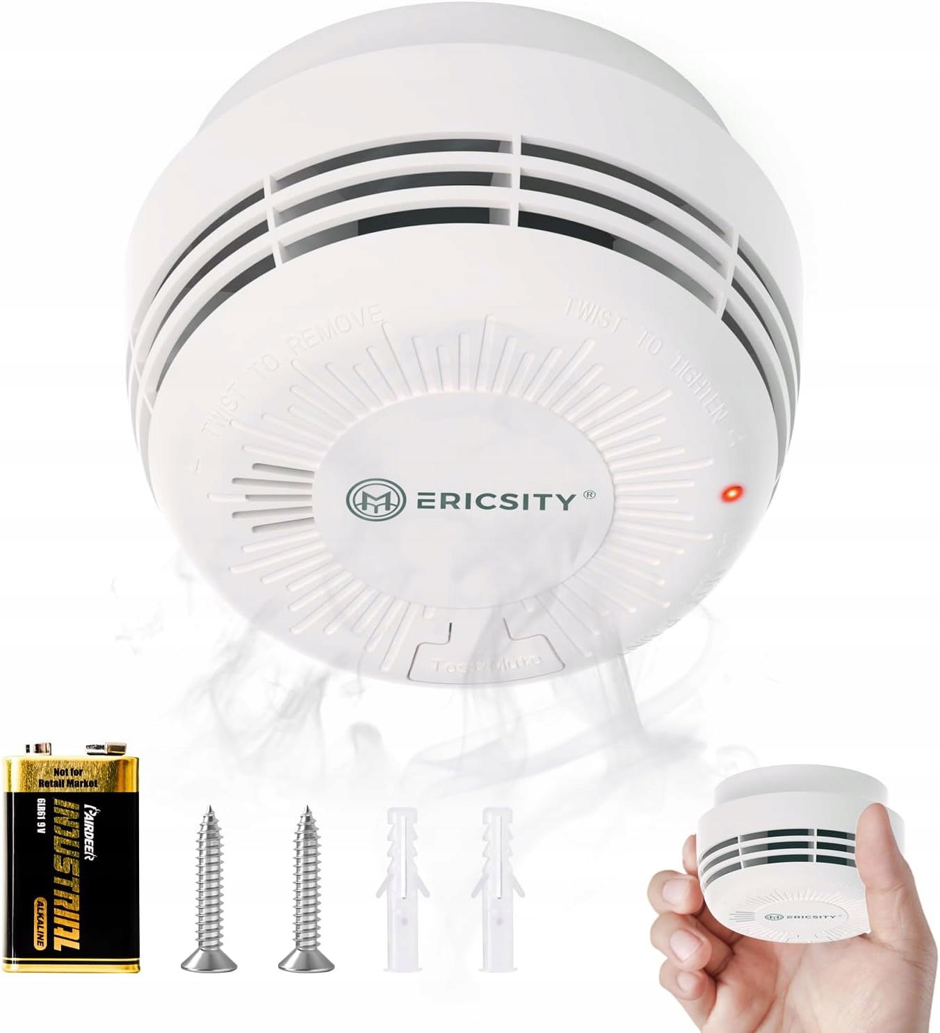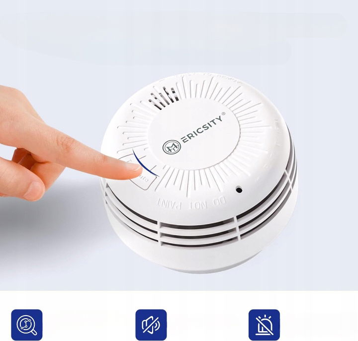 Certyfikat: Czujniki dymu Ericsity są przyjazne dla użytkownika z ochroną przed fałszywym alarmem i dużym przyciskiem testowym/wyciszającym. Alarm o wysokim poziomie decybeli: > 85 db/3 m, można go usłyszeć przez ściany.