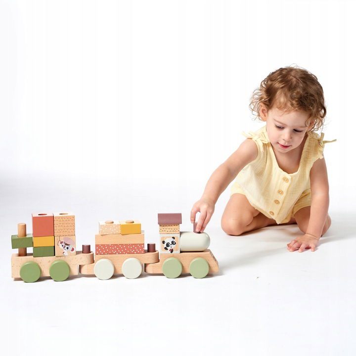 Aby ułożyć wagoniki pociągu, dzieci muszą dopasować 14 klocków, doskonaląc tym samym swoje umiejętności motoryczne i koordynację wzrokowo-ruchową.