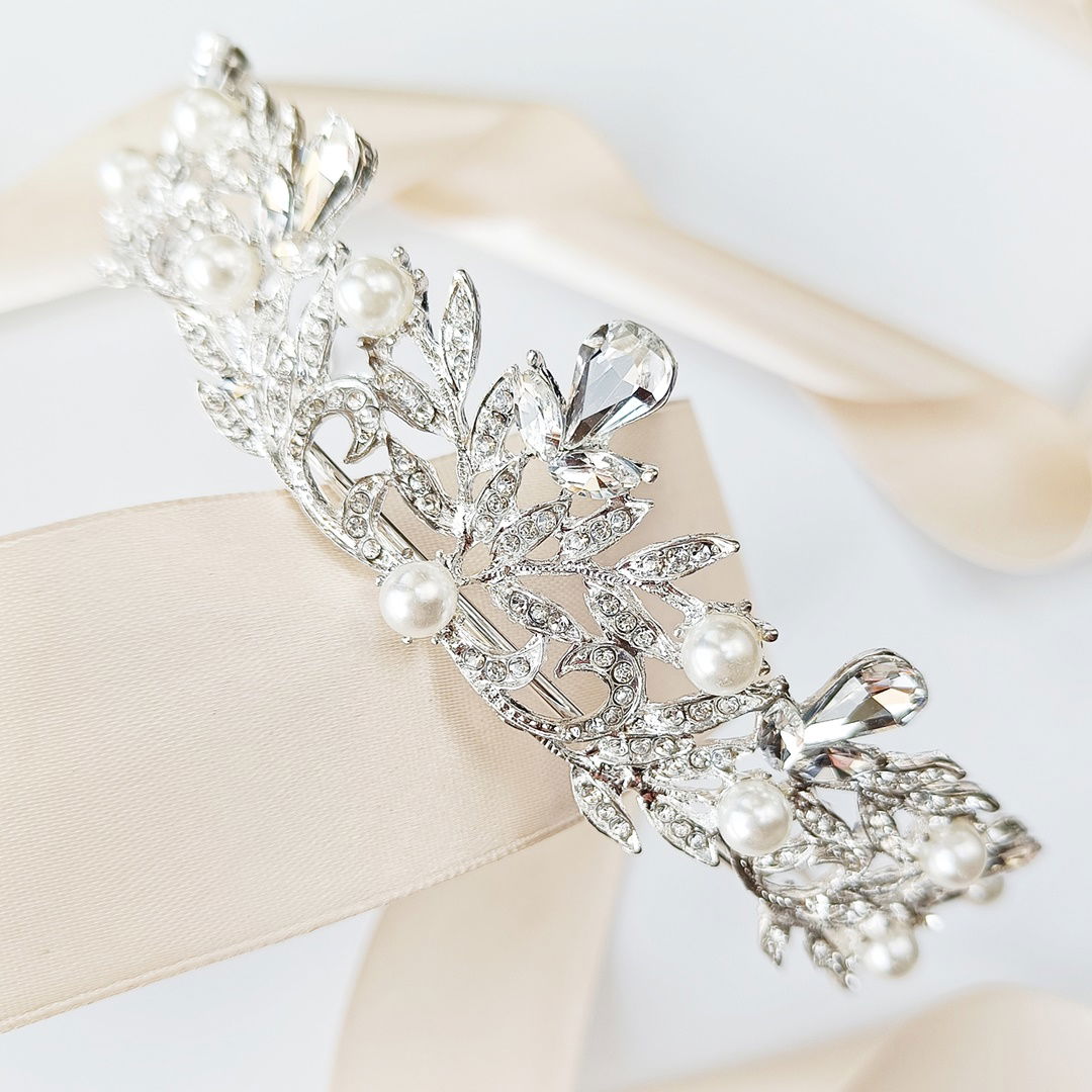 DIADEM tiara korona srebrna ŚLUBNA błyszcząca z perłami cyrkoniami