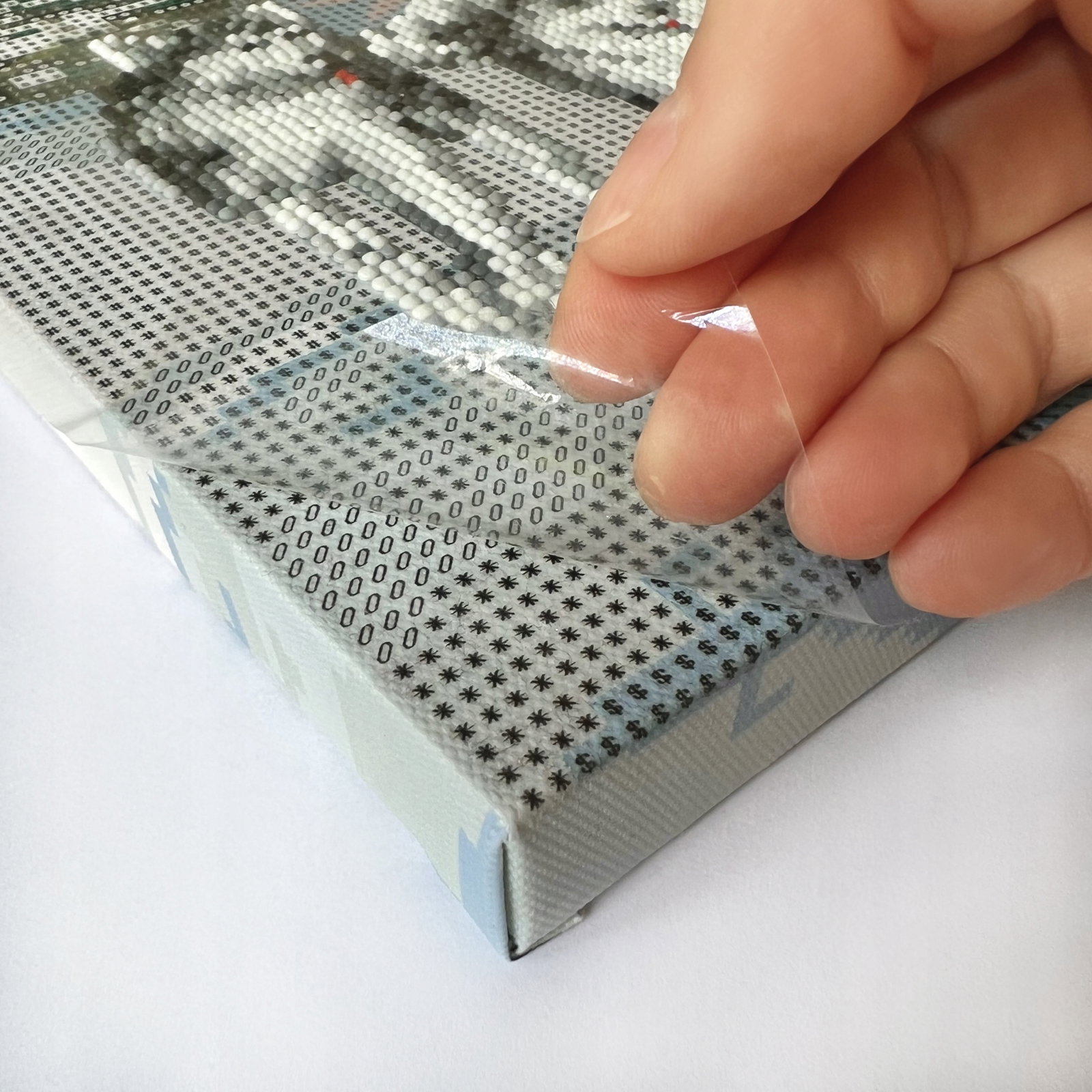 Płótno jest pokryte warstwą kleju, który zachowuje swoje właściwości klejące dzięki przezroczystej folii. Delikatnie odsłoń część folii ochronnej, aby powierzchnia płótna stała się lepka.