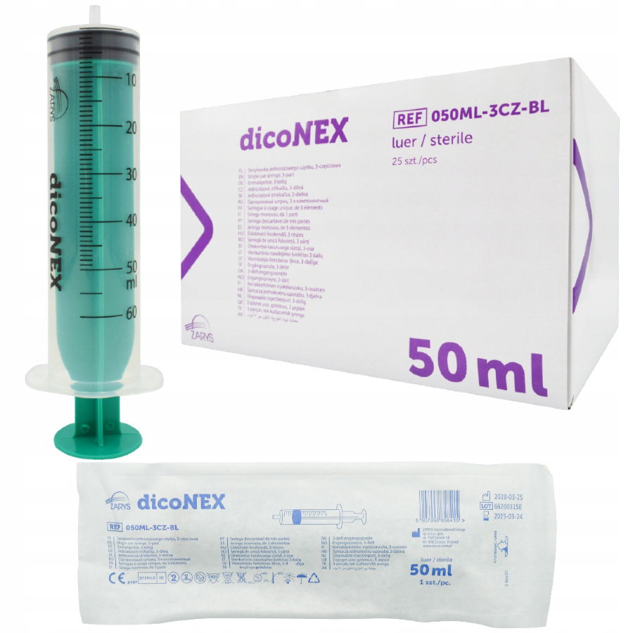 Strzykawki dicoNEX marki Zarys, 3-częściowe, o pojemności 50 ml z końcówką typu Luer. Strzykawki posiadają skalę. Nie zawierają związków chemicznych takich jak ftalany czy lateks. Sterylne (sterylizowane tlenkiem etylenu). Zestaw zawiera 25 strzykawek.