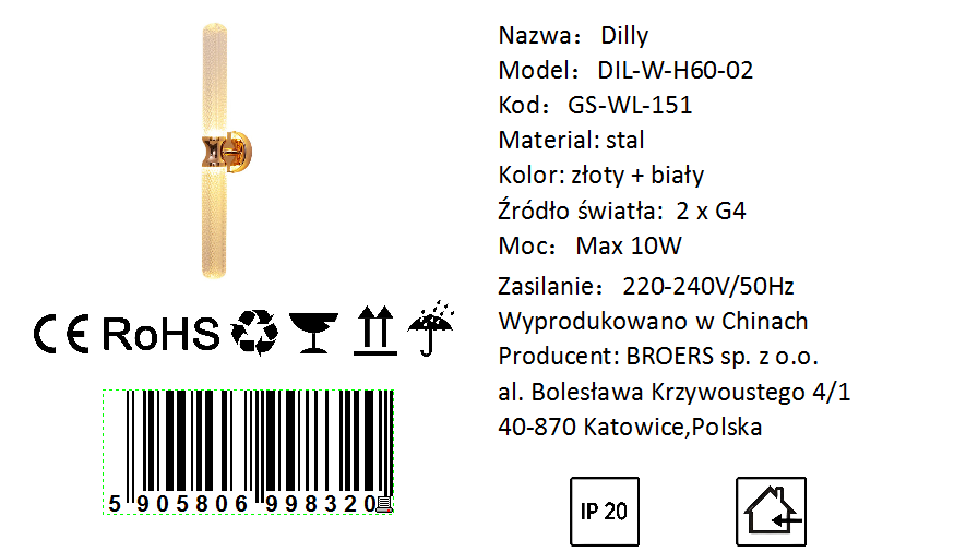 Podkreśl elegancję i luksus swojego wnętrza z lampą ścienną Dilly! Ten stylowy kinkiet to idealne połączenie luksusowych materiałów i funkcjonalności, oferując zarówno estetyczne, jak i wydajne oświetlenie. Wykończenie w złocie francuskim nadaje wnętrzu luksusowego uroku, a dwa źródła światła typu G4 zapewniają subtelne, ale wyrafinowane oświetlenie.