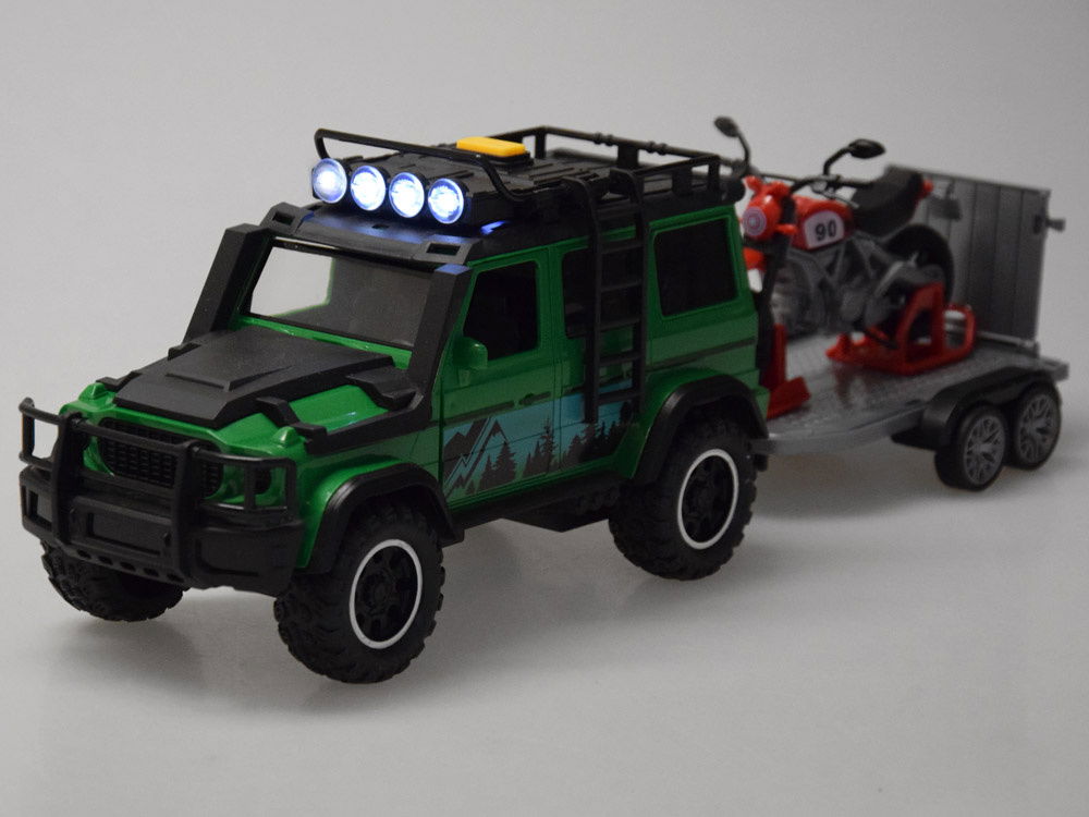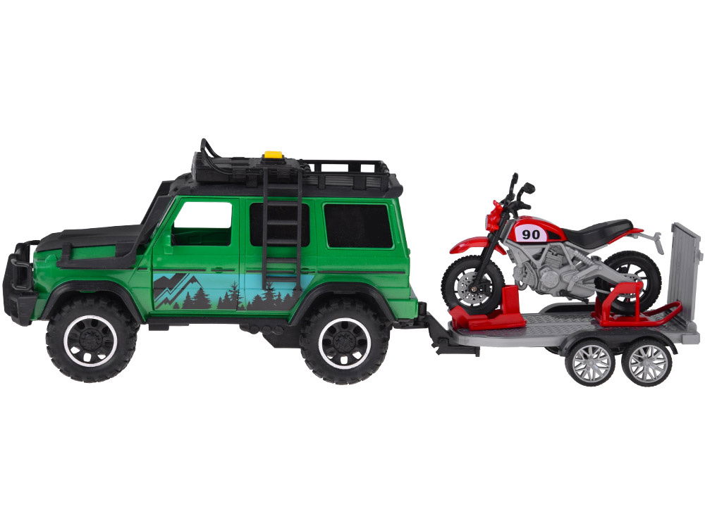 Zapewniamy Ci zestaw, który spełni oczekiwania każdego małego fana pojazdów oraz kreatywnej zabawy! Auto terenowe w kolorze zieleni z czarnymi akcentami to nie tylko efekty dźwiękowe i świetlne, ale także otwierane przednie drzwi i odpinana drabina. Do tego dołączona srebrna przyczepka typu laweta, idealna do przewozu motocykli lub innych ulubionych zabawek. Gumowe koła oraz możliwość przypięcia przyczepy sprawią, że dziecko poczuje się jak prawdziwy kierowca terenowego auta. Nie zapomnijmy o motorze, który również znajdziesz w zestawie! To wszystko zapewni wiele godzin ekscytującej zabawy. Wymiary zestawu: ok. 40 cm x 13 cm x 11 cm. Odkryj pasję do pojazdów i realistyczne przygody już dziś!