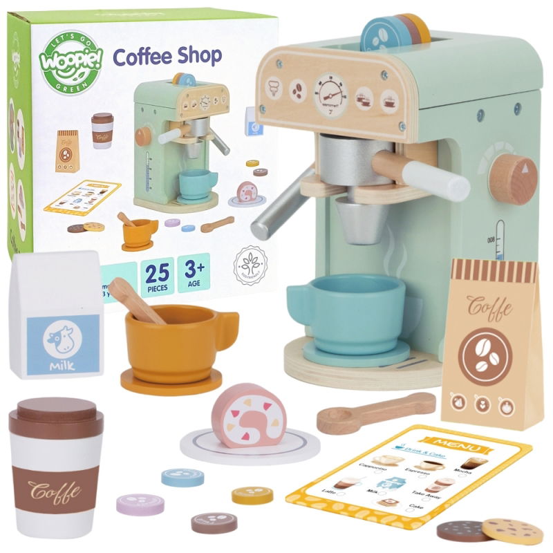 Zapraszamy do magicznej kawiarni Woopie Green, gdzie dzieci mogą stać się małymi baristami! Ten zestaw zawiera wszystko, czego potrzeba do urządzenia własnej kawiarni, w tym ekspres do kawy, kapsułki, filiżanki, mleko i wiele innych akcesoriów. Wykonany z naturalnego drewna i bezpiecznych farb, zapewnia nie tylko realistyczny wygląd, ale także bezpieczeństwo podczas zabawy.