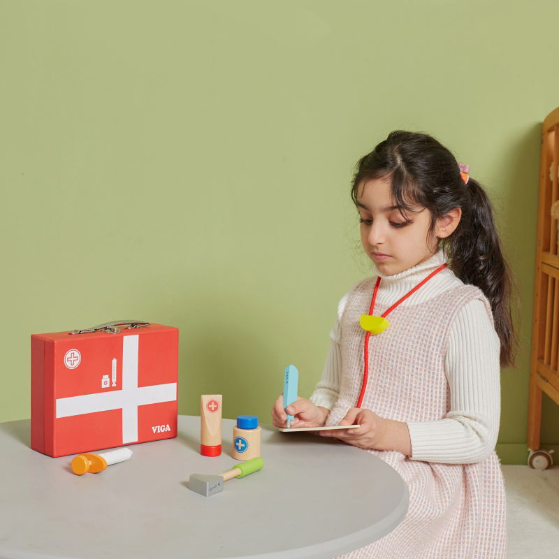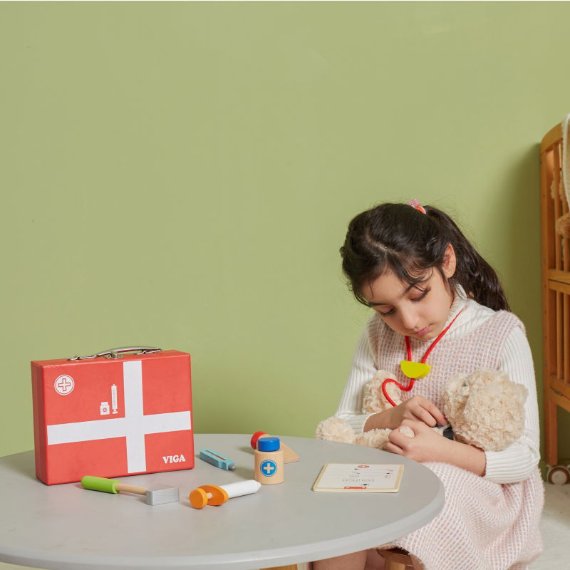 Zestaw "Doktor Mały Lekarz" to kompletny zestaw do zabawy w lekarza, który rozbudzi wyobraźnię i rozwija empatię u przyszłych lekarzy i pielęgniarek. W skład zestawu wchodzi stetoskop, termometr, strzykawka, młoteczek, maść, karta pacjenta, syrop oraz elegancka drewniana walizka lekarska. Wykonany z naturalnego drewna, zestaw nie tylko zachwyca designem, lecz także wspiera rozwój zdolności poznawczych i kreatywności u dzieci. Idealny prezent, który pomaga przezwyciężyć strach przed wizytą u lekarza. Dzięki tej zabawce dzieci uczą się odpowiedzialności, empatii oraz rozwijają swoją wyobraźnię. Spraw, by Twoje dziecko czerpało radość z nauki i rozwijania swoich umiejętności w atmosferze zabawy!
