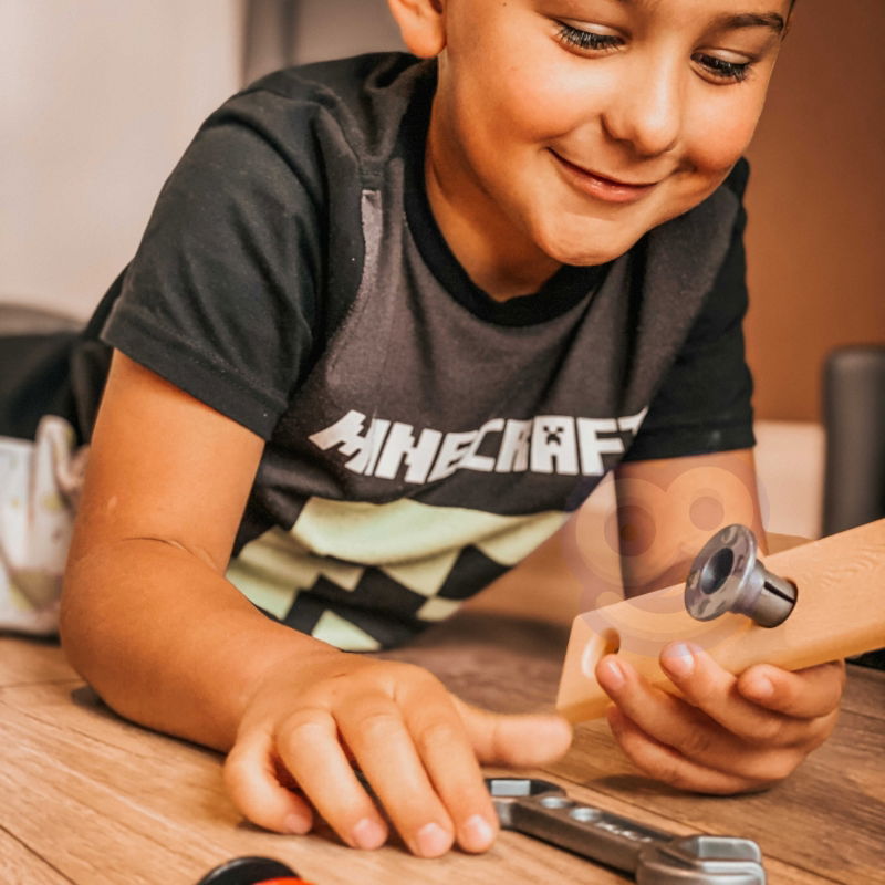 Zestaw narzędzi to idealna propozycja dla małych majsterkowiczów! Skrzynka z narzędziami w kolorze ciemno-zielonym z wygodną żółtą rączką zawiera 15 elementów, w tym wkrętarko-wiertarkę na baterie z 3 wymiennymi końcówkami. Dzieci będą zachwycone realistycznymi dźwiękami i obrotowym wkrętem wkrętarki. Dodatkowo w zestawie znajduje się piła, młotek, klucz francuski, dwie deseczki z otworami do wkręcania śrub (4 w zestawie) lub wbijania gwoździ (2 w zestawie). Zabawka rozwija zdolności manualne, logiczne myślenie i kreatywność dzieci. Produkt jest przeznaczony dla dzieci od 3 roku życia, wykonany z bezpiecznego plastiku. Wymiary skrzynki na narzędzia to 31 x 22,5 x 16,5 cm, a długość wkrętarki wynosi około 21 cm. Zestaw nie zawiera baterii R6/AA. Pozwól swojemu dziecku odkryć świat majsterkowania z WOOPIE!
