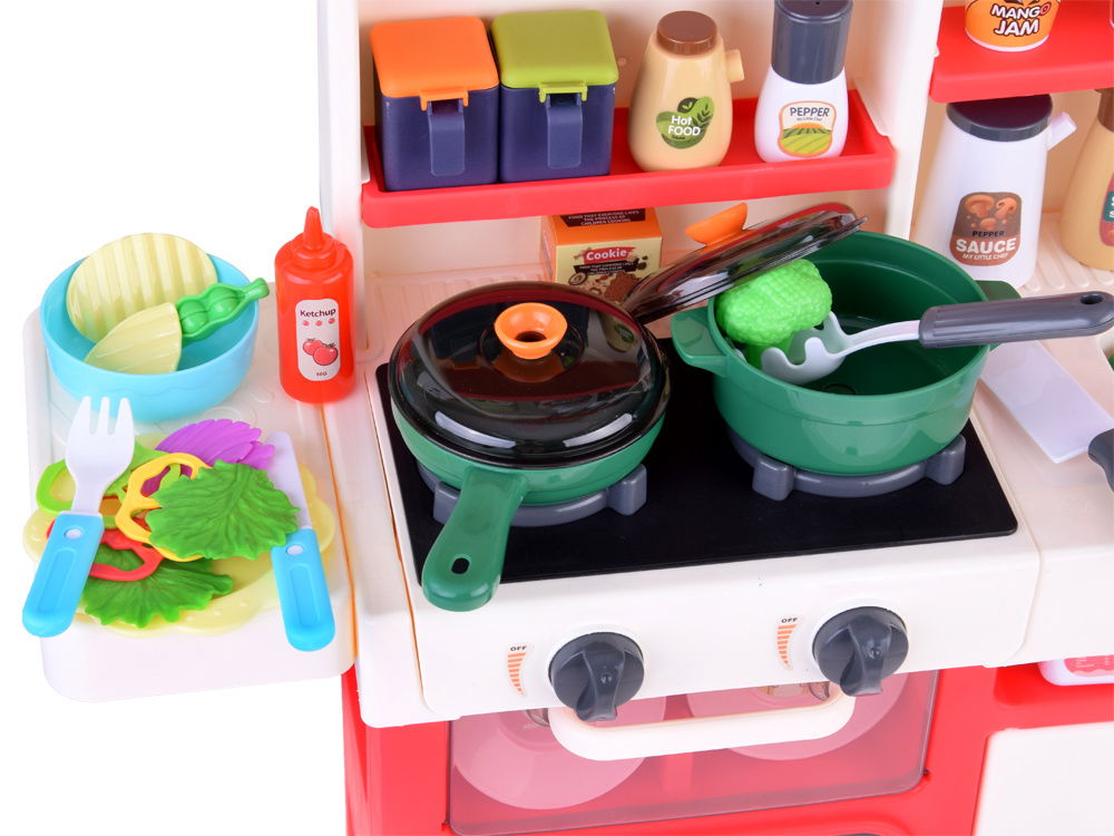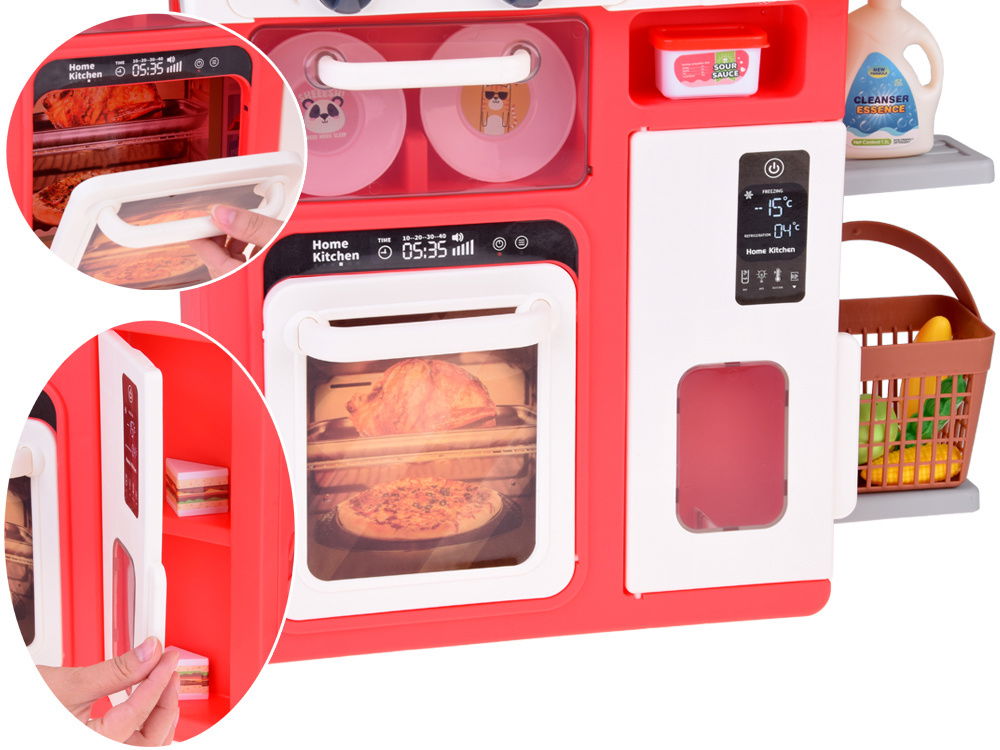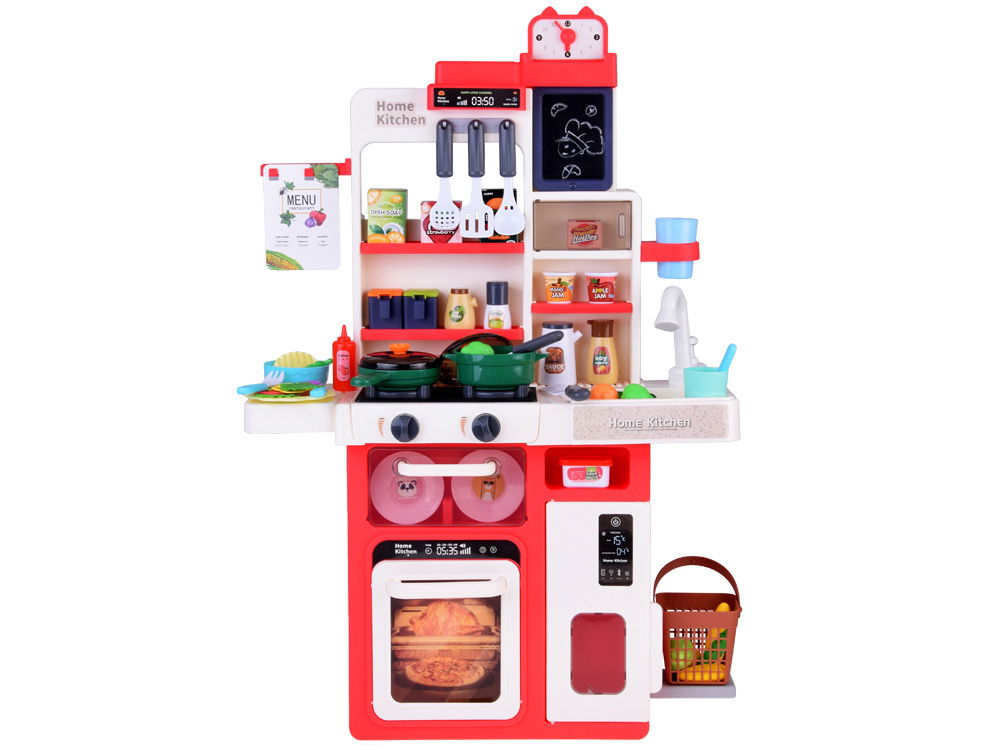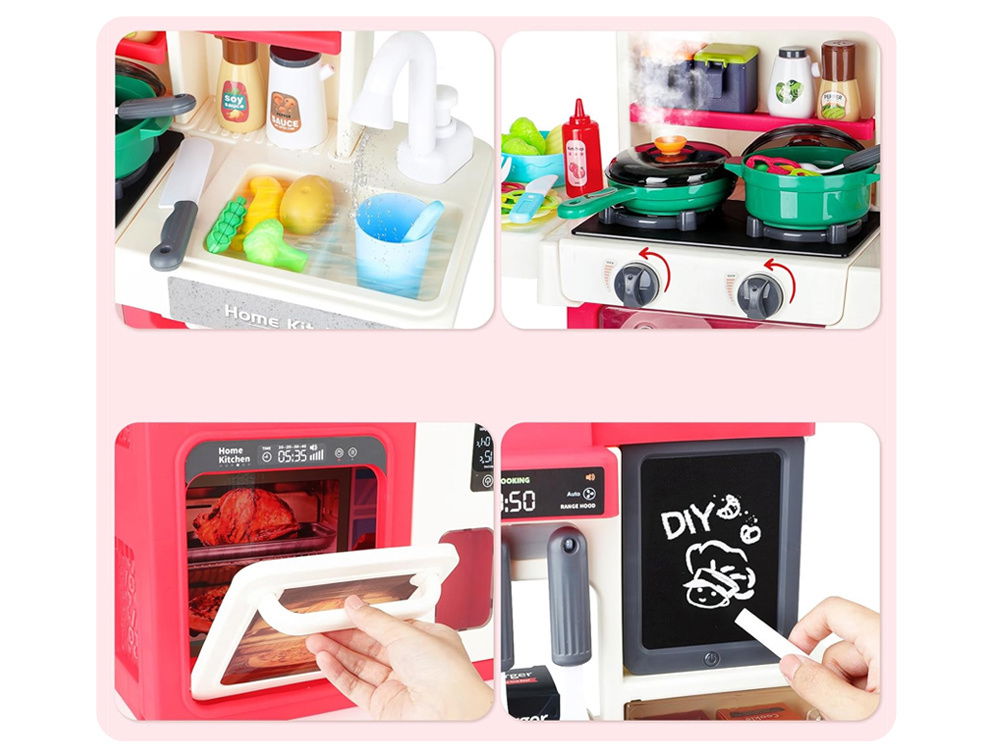 Ta fantastyczna kuchnia dla dzieci w delikatnych pastelowych odcieniach to prawdziwe centrum kulinarnych przygód! Wyposażona w dwa podświetlane palniki, kran z pompką do wody oraz szafki, lodówkę, zmywarkę i piekarnik, przenosi maluchy w świat kreatywnej zabawy. Dodatkowo zawiera tablicę do rysowania, zegar i aż 66 różnorodnych akcesoriów kuchennych.