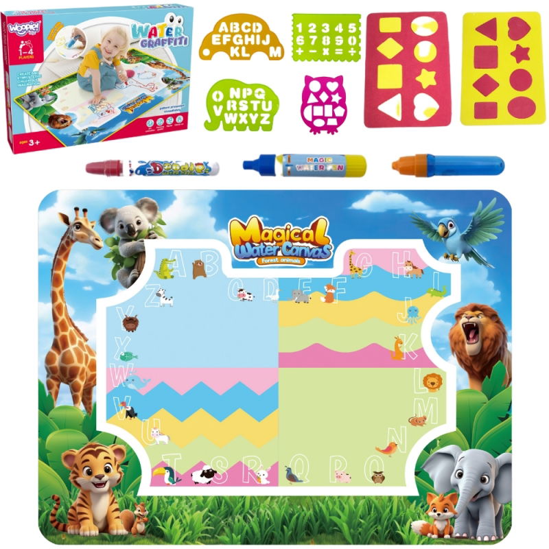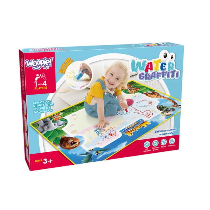 Dzięki tej zabawce dzieci rozwijają motorykę, kreatywność, logikę i koncentrację. Łatwa w użyciu, ergonomiczne pisaki i pędzelki wodne można łatwo napełnić z kranu. Mata jest łatwa do zwinięcia, idealna do zabrania w podróż. Pozwól dziecku odkryć świat sztuki i nauki w jednym!"