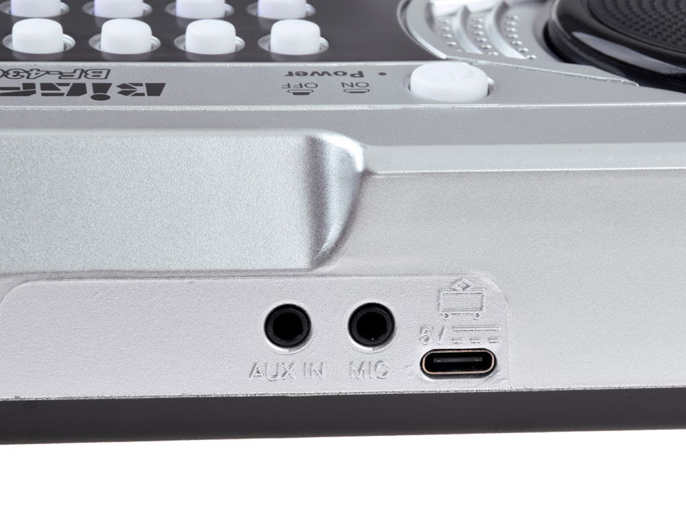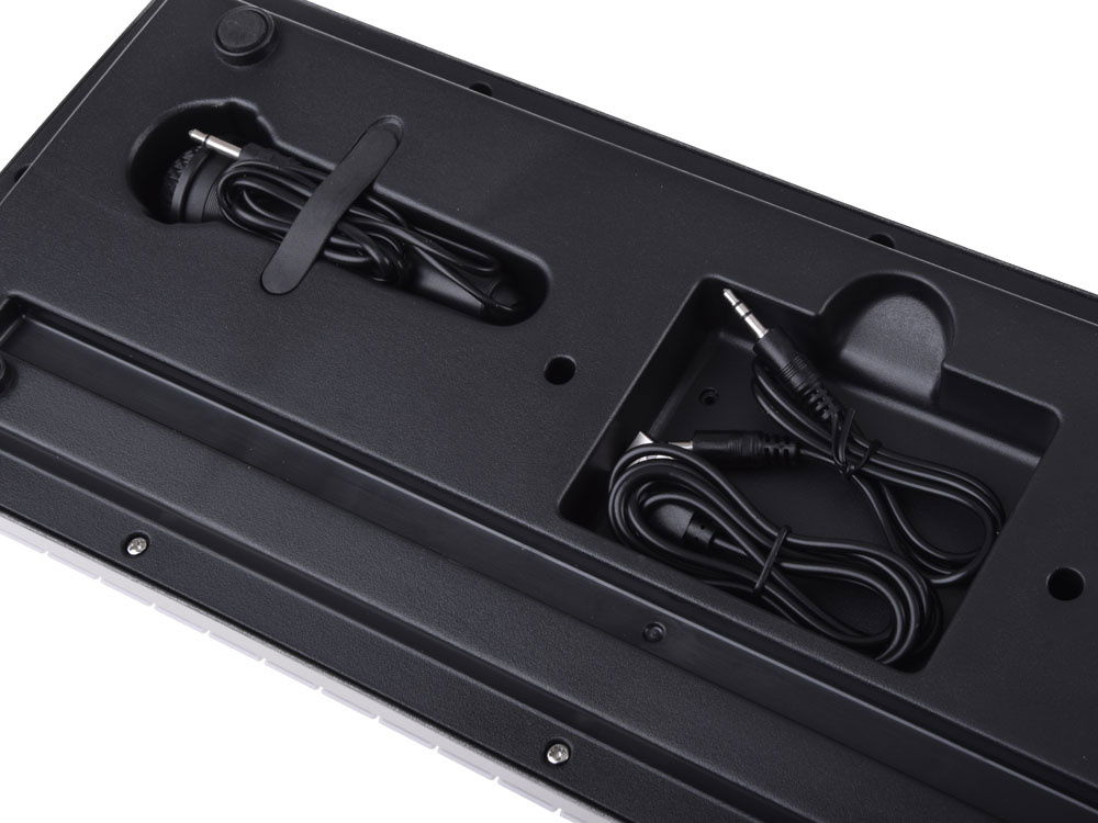 Dodatkowo, Mini Keyboard posiada funkcję AUX IN, umożliwiającą podłączenie smartfona lub odtwarzacza MP3, oraz mikrofon w zestawie, idealny do zabawy w karaoke. Antypoślizgowa podstawa zapobiega przesuwaniu się instrumentu podczas gry.