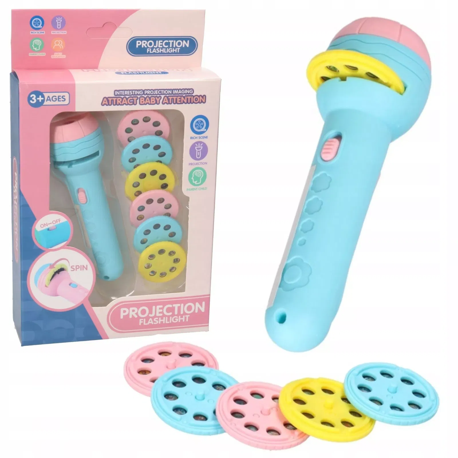 Projektor może także pełnić rolę lampki nocnej, co pozwoli dziecku zasnąć spokojnie. Prosta obsługa - wystarczy włożyć krążek ze slajdem, włączyć urządzenie, a na ścianie pojawią się magiczne obrazy. Praktyczny włącznik on/off ułatwia korzystanie z projektora.