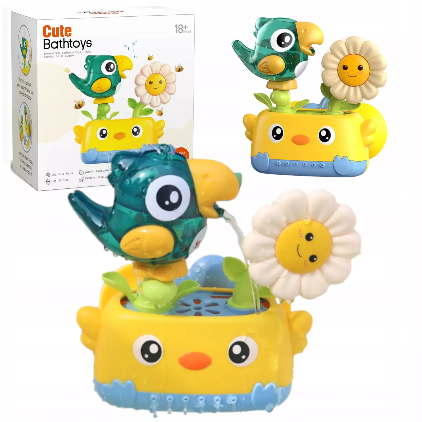 Dzięki inteligentnemu mechanizmowi zasilanemu siłą przepływu wody, wystarczy delikatnie napełnić fontannę wodą, aby uruchomić całe widowisko – kwiatek zacznie kręcić się, a woda rozpryskiwać się w postaci pięknych strumieni. Dodatkowo, zabawka wyposażona jest w grającą papugę, efekt deszczu tworzący efektowny prysznic oraz solidną przyssawkę, która zapewnia stabilność podczas zabawy.