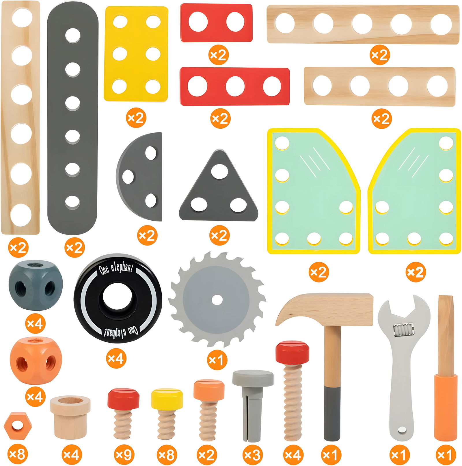Składa się z 76 drewnianych elementów, w tym narzędzi takich jak młotek, piła, śrubokręt, klucz, linijka i kątownik. Dzieci mogą skonstruować aż 9 różnych zabawek, w tym roboty czy statki, korzystając z instrukcji i dodatkowych elementów zawartych w zestawie. Bezpieczna konstrukcja bez ostrych krawędzi zapewnia komfort i bezpieczeństwo podczas zabawy. Warsztat ma także praktyczną półeczkę na przechowywanie akcesoriów, co pomaga zachować porządek w pokoju. Ta zabawka nie tylko bawi, ale także rozwija umiejętności motoryczne, koordynację ręka-oko, wyobraźnię i kreatywność dziecka. Pozwól swojemu małemu majsterkowiczowi czerpać radość z tworzenia własnych konstrukcji dzięki temu kompleksowemu zestawowi narzędziowemu!