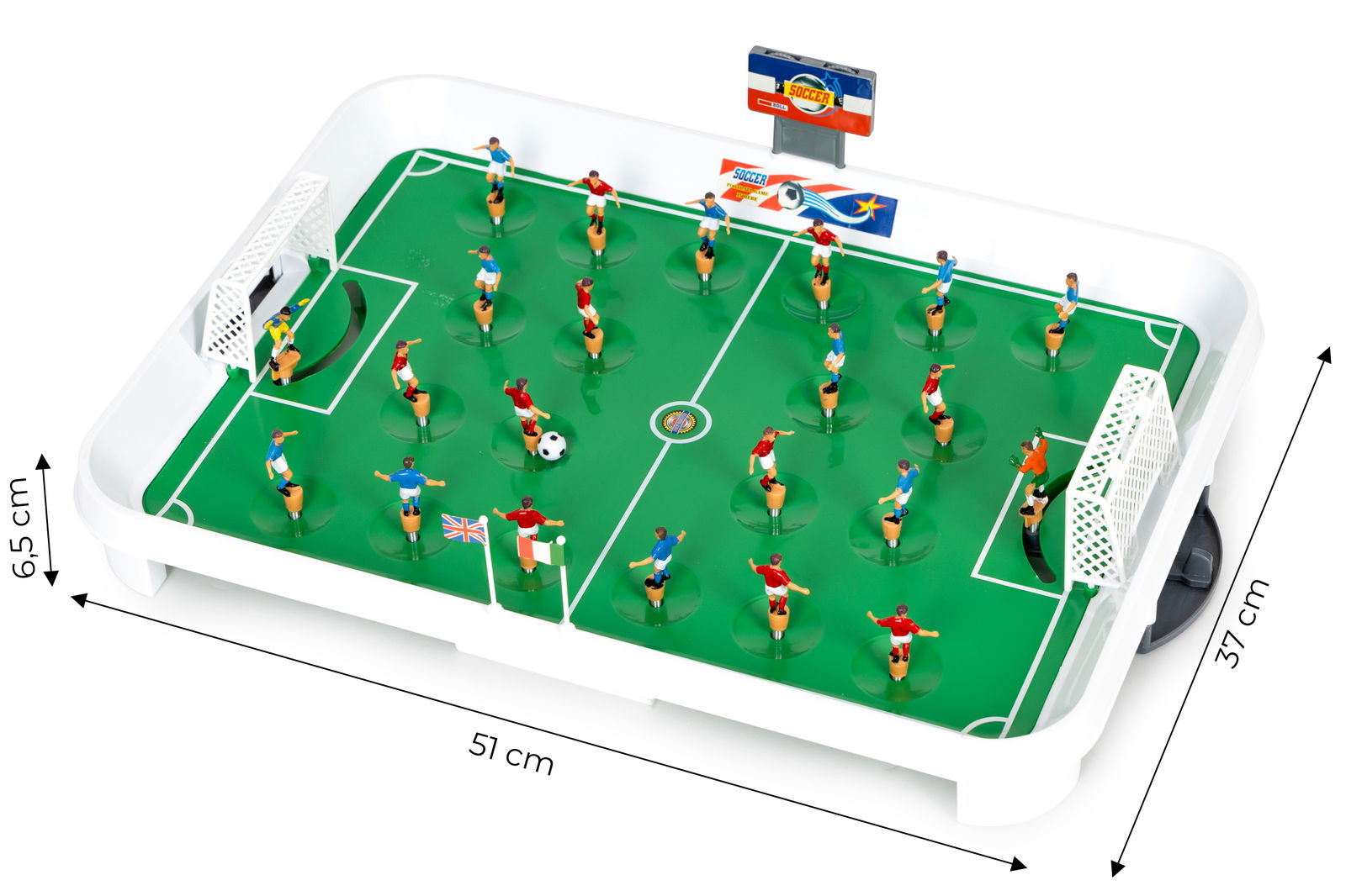 W zestawie znajduje się 22 zawodników, w tym 2 bramkarzy, piłka, tablica wyników i naklejki z flagami państw. Dzięki sprężynom pod postaciami piłkarzy, rozgrywka nabiera dynamiki, a ruchomy bramkarz umożliwia precyzyjne przesuwanie, co sprawia, że zabawa staje się bardziej realistyczna. Tablica wyników pozwala na śledzenie punktacji i kontrolowanie stanu meczu. Ten kompaktowy zestaw gwarantuje niezapomniane emocje i dynamiczne rozgrywki, zapewniając wiele godzin radosnej zabawy dla małych entuzjastów piłki nożnej.