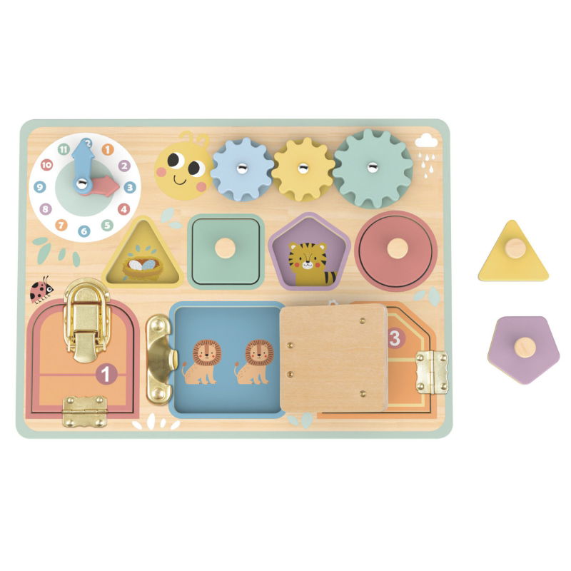 prezentuje fantastyczną tablicę edukacyjną, która przenosi dzieci w magiczny świat odkrywania tajemnic zamków i zapięć. Wykonana z solidnej drewnianej płyty, tablica skrywa trzy różnorodne zamki ukrywające urocze obrazki zwierząt, inspirujące wyobraźnię maluchów. Wzbogacona interaktywnymi kołami zębatymi, umożliwiającymi rozwijanie zdolności motorycznych i percepcji światła i cienia. Dodatkowo zawiera układankę z pinezkami o różnych kształtach i kolorach, zachęcającą do logicznego myślenia i eksploracji. Tablica wyposażona jest także w uroczy zegar z ruchomymi wskazówkami, umożliwiając naukę godzin i rozwijanie umiejętności obserwacji czasu. Zabawka przeznaczona jest dla dzieci od 3 roku życia, wykonana z drewna i pomalowana bezpiecznymi farbami. To kompleksowe rozwiązanie edukacyjne, które wspiera rozwój małej motoryki, zdolności manualnych, koordynacji, kreatywności i wyobraźni u najmłodszych.