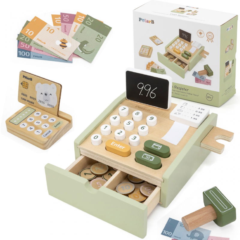 Zapraszamy do magicznego świata sklepowych interakcji z naszą Kasa Sklepową! Ta drewniana zabawka to doskonały sposób na rozwijanie umiejętności komunikacyjnych i matematycznych u dzieci już od 3 roku życia. Przeżyj przygodę jako kasjer lub klient, przyjmuj płatności gotówką lub kartą, licz sumy i wydawaj resztę. W zestawie znajdziesz banknoty, monety, kartę płatniczą i terminal płatniczy. Kasa posiada wyświetlacz z dwustronną mini tablicą kredową, wysuwaną szufladę, skaner, przyciski i rolkę papieru - wszystko, co potrzebne do realistycznej zabawy sklepowej. Ta zabawka nie tylko rozwija umiejętność liczenia i zdolności społeczne, ale także wspiera rozwój logicznego myślenia i wyobraźni u dzieci. Dzięki Kasa Sklepowej, matematyka stanie się ulubionym przedmiotem każdego malucha!