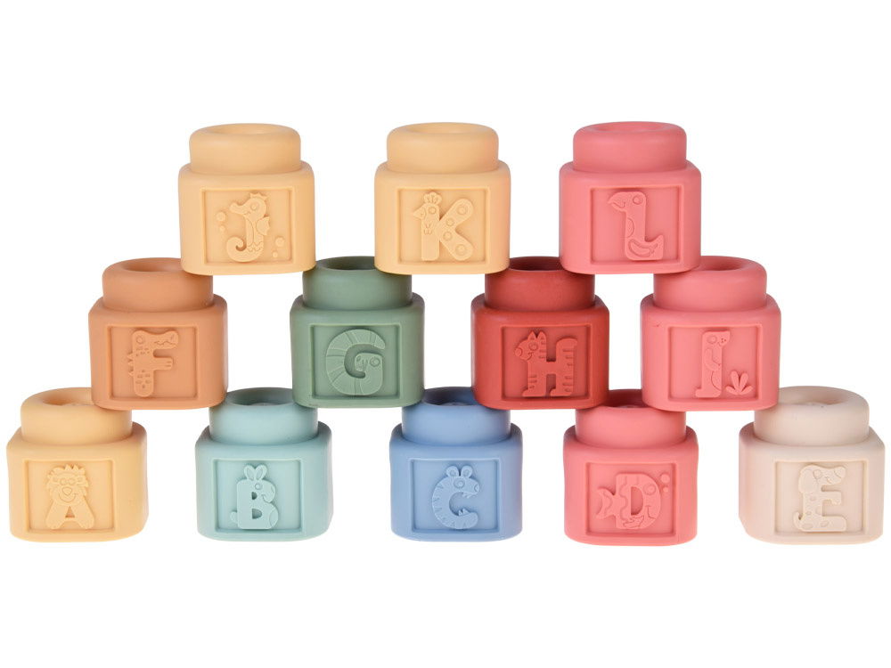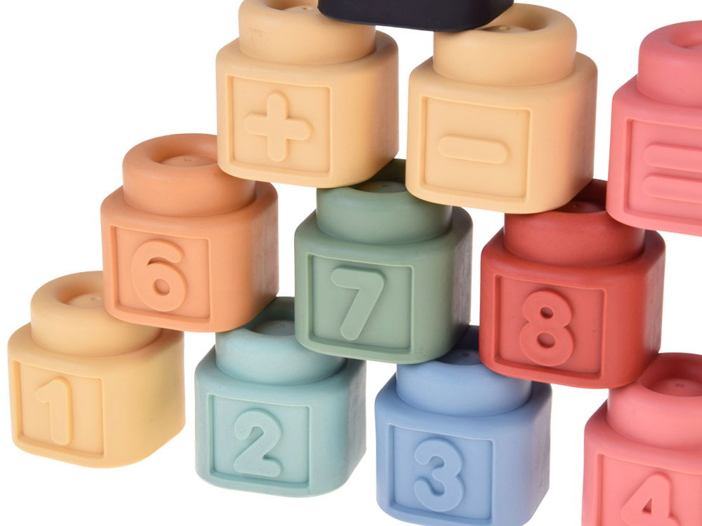 Klocki wykonane z miękkiego, elastycznego tworzywa gumowego są bezpieczne i nietoksyczne, idealne już od 12. miesiąca życia. Każdy klocek posiada wypukłe wzory liter, cyfr, zwierząt i różnych kolorów, wspierając rozwój sensoryczny i poznawczy dziecka.