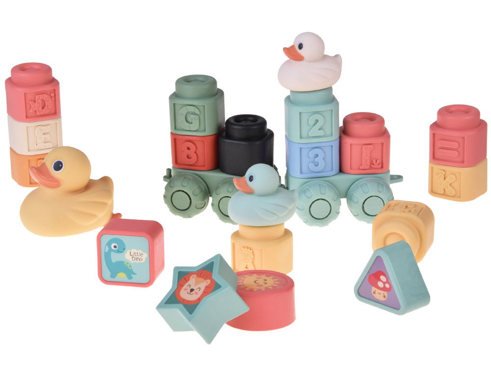 Dodatkowo, urocze kaczuszki wydają delikatny dźwięk po naciśnięciu, co pobudza ciekawość malucha. Klocki świetnie sprawdzają się także podczas zabawy w wodzie, nadając się do aktywności zarówno w wannie, jak i basenie.
